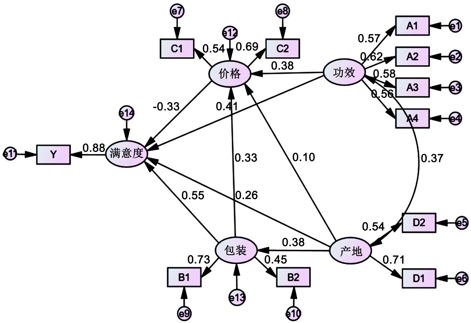 功效(外生潜在变量)可以反映出购买渠道(A1)、年消费总量(A2)、消费目的(A3)、倾向品牌(A4);产地(外生潜在变量)可以反映出购买方便性(D1)、产品类型(D2);包装(内生潜在变量)可以反映出包装倾向(B1)、接受价格(B2);价格(内生潜在变量)可以反映出了解程度(C1)、年消费次数(C2);消费者满意度则可以反映出口碑(Y)。