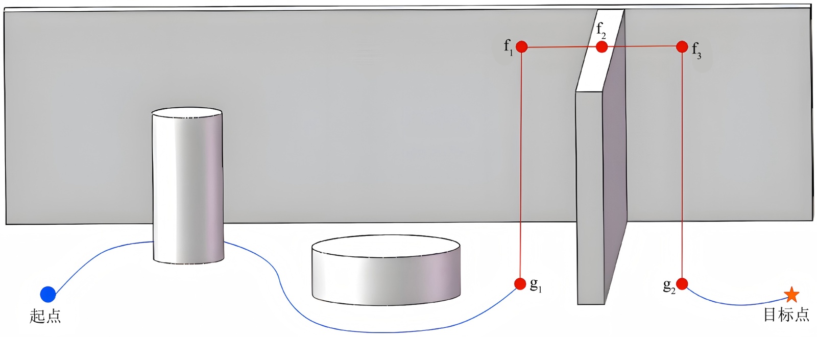 本研究针对不同障碍实施差异化策略。对低障碍物采用地面绕行,通过计算绕行代价决定最优路径;中等高度障碍物则通过比较绕行和飞行之间的代价,选择出代价更低的路径;考虑到灾害现场较高障碍物存在二次事故风险,规定只能采用飞行路径,这种分类决策机制使机器人能够根据环境特征自适应选择最优运动模式。