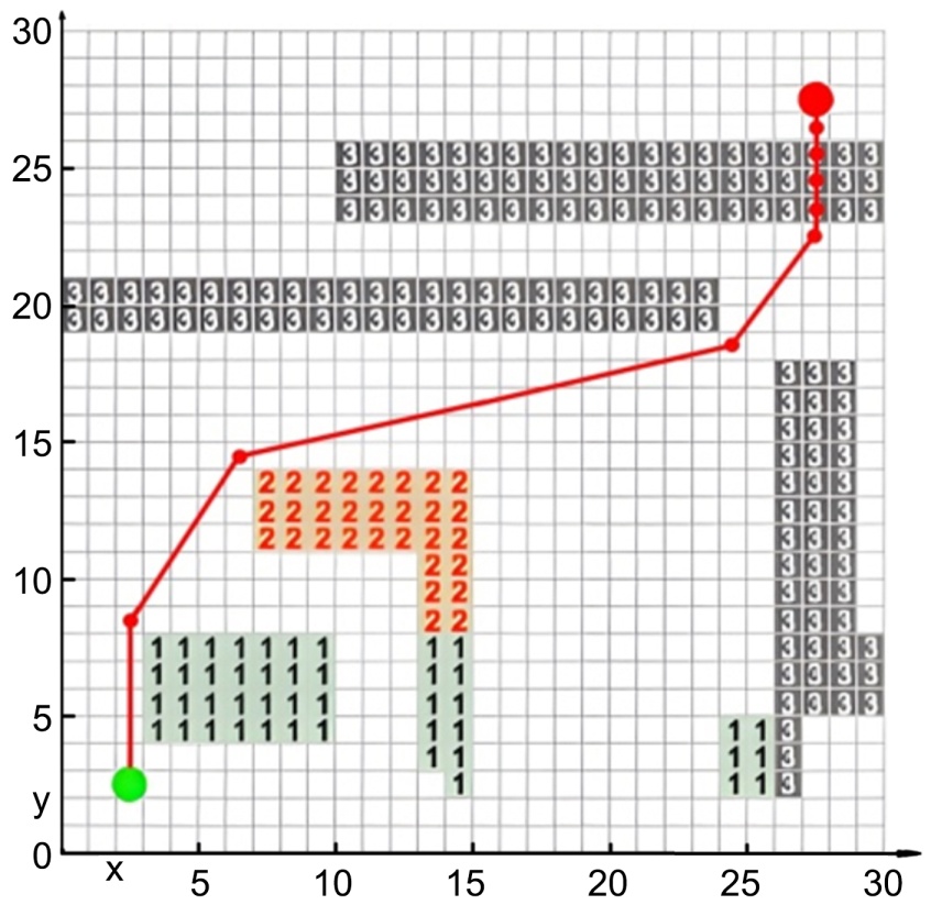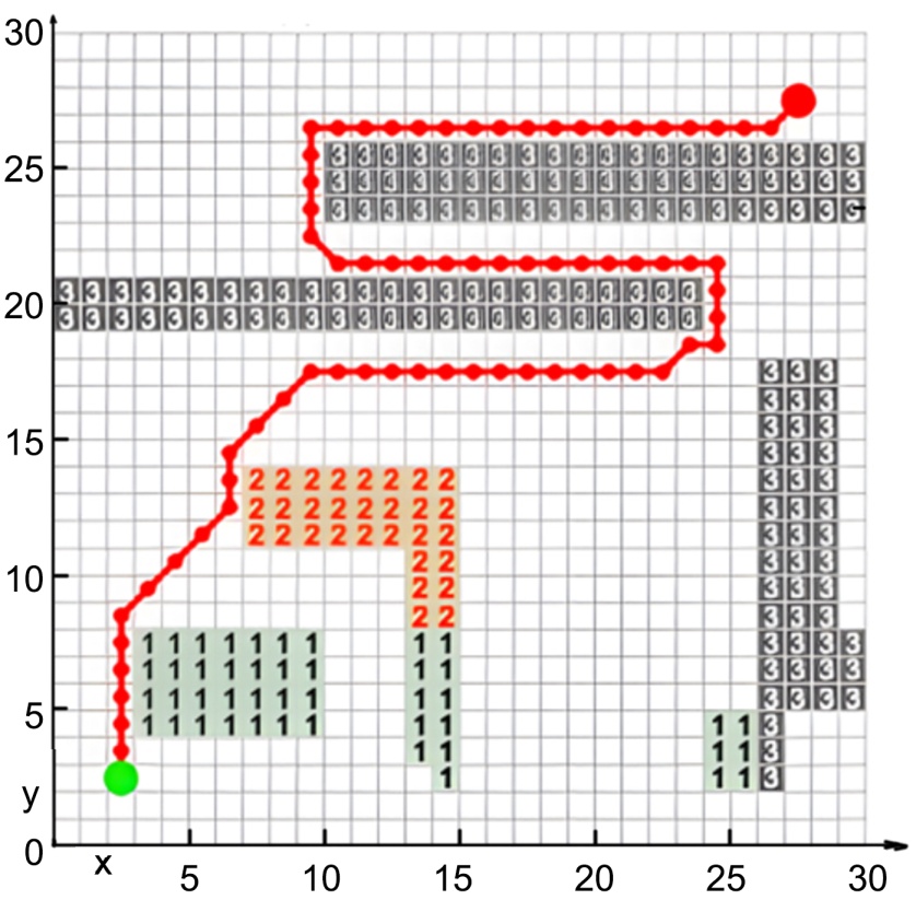 依据障碍物高度与机器人运动能力,将灾场障碍划分为三个类别:高度低于1.0 m的低障碍物(碎石堆)、高度在1.0至2.5 m之间的中等障碍物(破损墙体)以及高度超过2.5 m的高障碍物(未完全倒塌的楼板),三种障碍物分别对应Z = 1、2、3的栅格编码。分别用绿色、橙色、灰色三种颜色进行表征。根据上述方法,对30 × 30边长的环境进行2.5维栅格地图的建立,如图2所示。