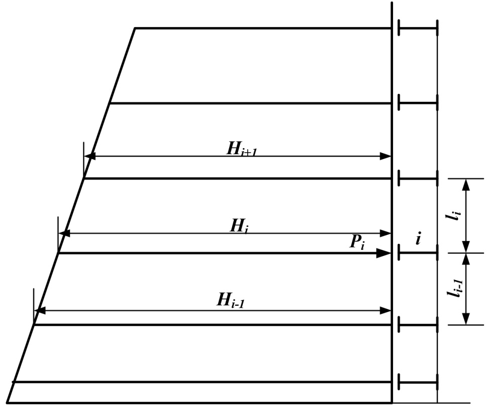 钢闸门中主梁主要承受水压力以及自重、泥沙等荷载,而次梁、边梁、纵梁主要起减小跨度、导向、加强刚度等作用,因此对于主梁的布置与强度计算是十分重要的。多主梁的荷载计算是一个超静定问题,不仅与相对刚度有关,也取决于几何位置。本文使用相邻间距和之半法,多主梁荷载计算简图如图3所示,其受面板传递的梯形荷载和纵梁的集中荷载,单位宽度上的荷载为: