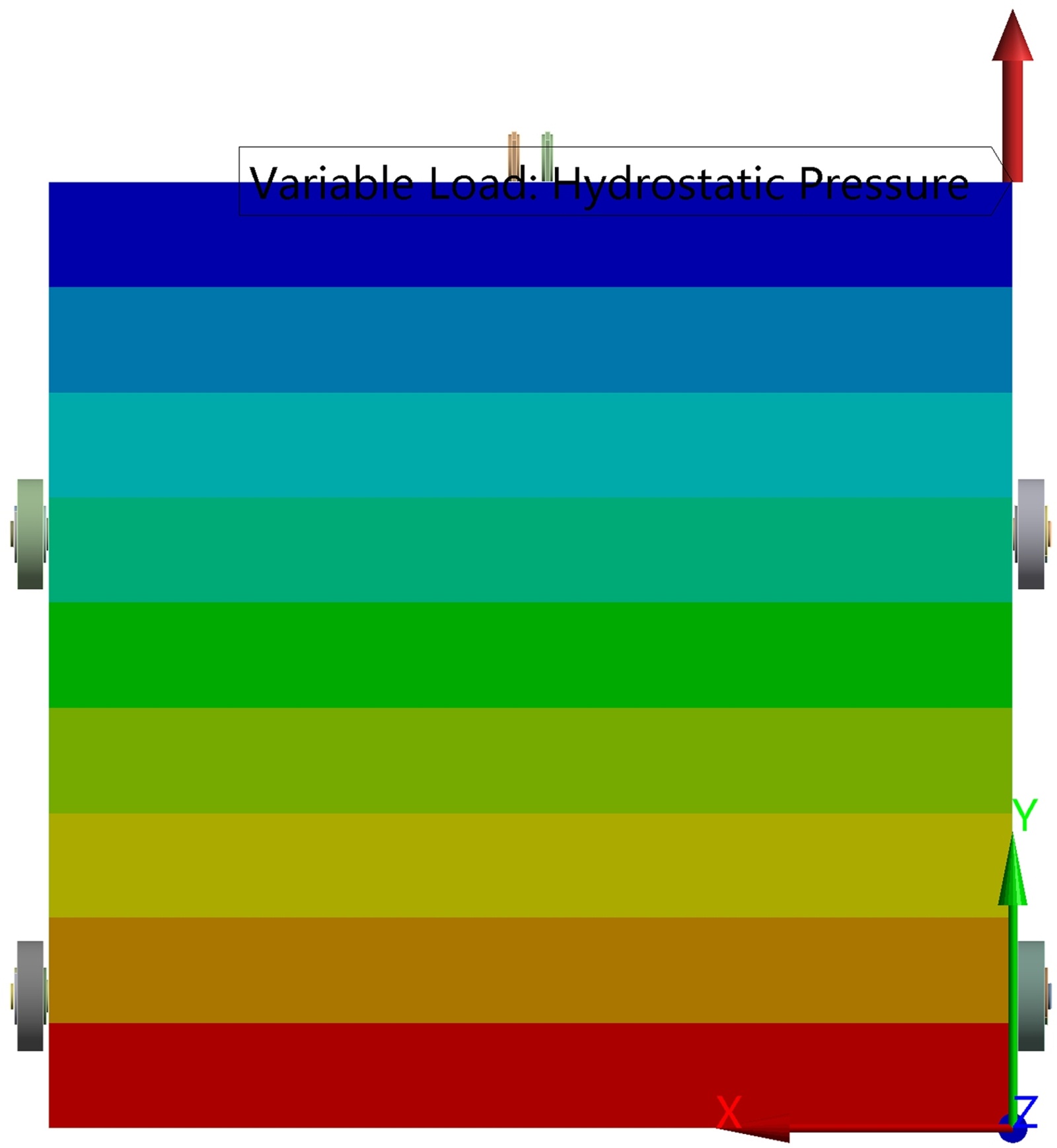 平面闸门主要受静水压力荷载以及自身的自重,面板在上游迎水,因此将水压力按梯度施加到面板侧,自由液面高度为工程中的最高挡水头4 m,流体密度即为水的密度,为10−6 kg/mm3,流体静力学加速度为9.8 m/s2,重力加速度沿y轴负方向设置为9.8 m/s2,静水压力的加载如图7所示。