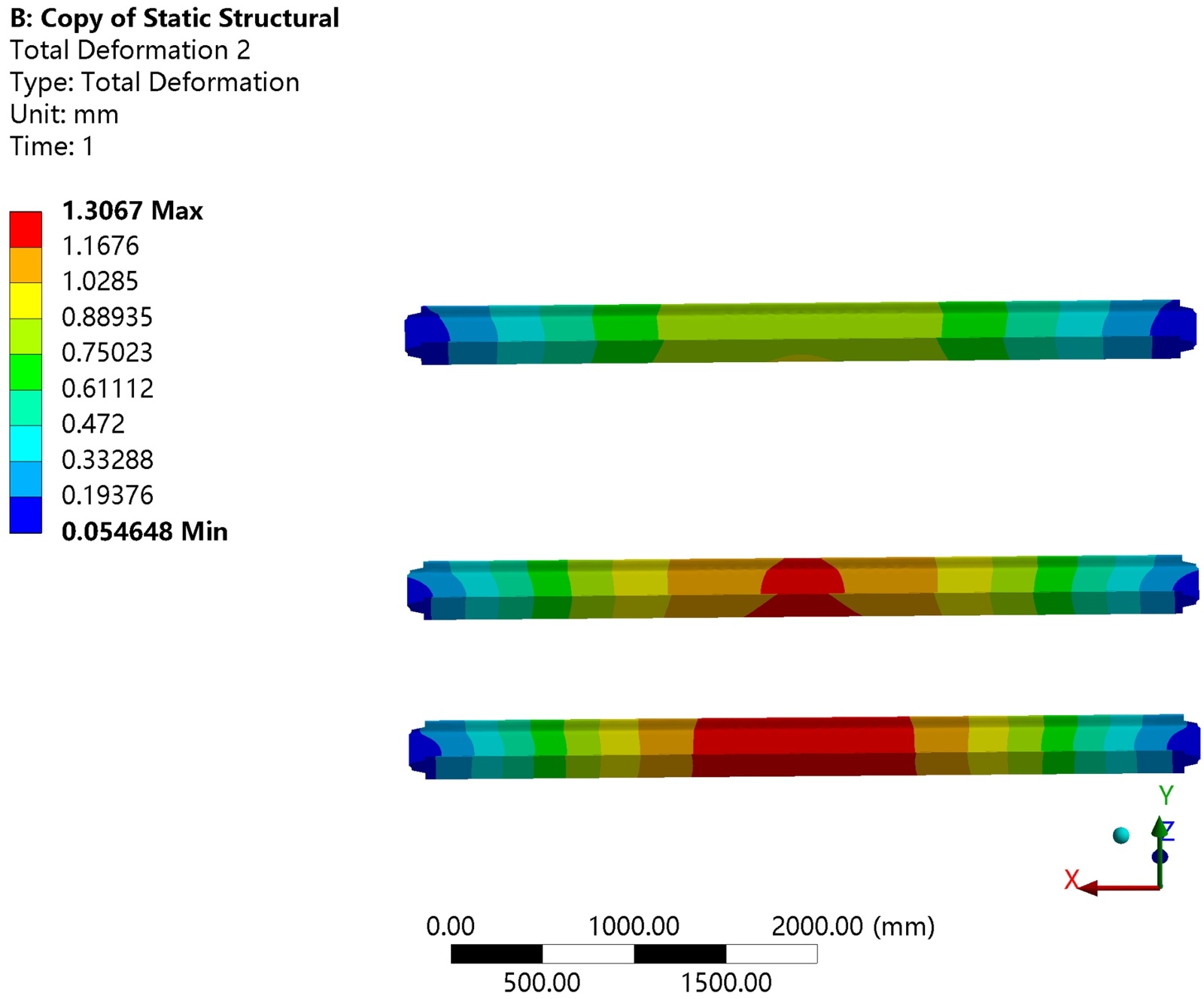 根据每根主梁的荷载分布进一步计算主梁的最大弯矩,通过相关规范确定面板有效宽度,并采用组合截面法计算主梁截面的惯性矩、静面矩、抗弯模量等特性后,主梁前后翼缘的拉压应力、最大挠度分别为: