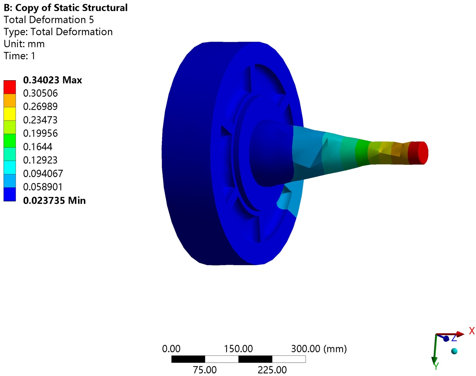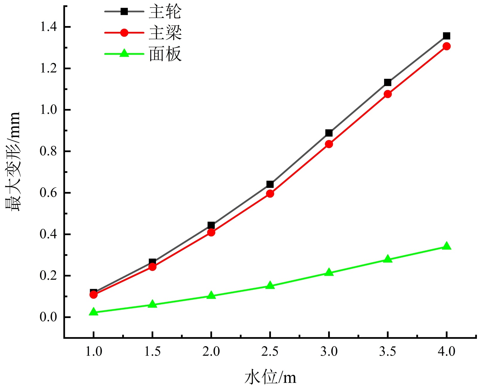 研究闸门前在1~4 m不同水位下的应力与变形,如图10、图11所示,可以发现主轮、面板、主梁在挡1 m水头时受力较小,随着水位的上升,各构件的应力与变形随之增大,且相较于低水头,水位越高,闸门的各主要受力部件的应力明显增大。因此,在水位较高时,尤其是潜孔、深孔闸门,应加强对结构的设计,并进行理论与仿真的校核验算,保证闸门的安全稳定运行。