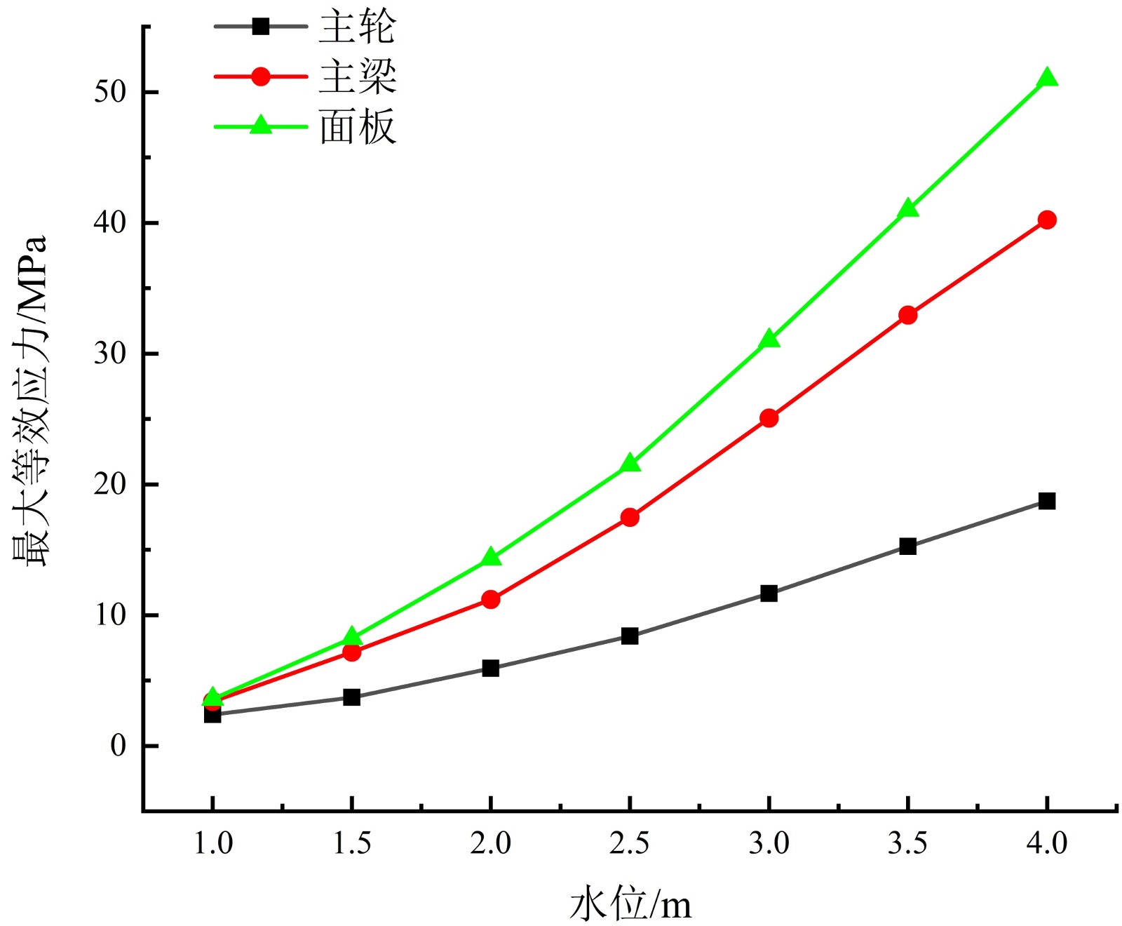 1) 在静水压力、自重等荷载的作用下,主梁为核心承重与传力构件,其最大应力与变形位于后翼缘的跨中处,其他梁系受力较小,主要起减小跨度、导向等作用,主轮轮轴与边梁的接触处出现应力集中现象。可根据研究结果针对性地采取加固措施,优化整体结构。