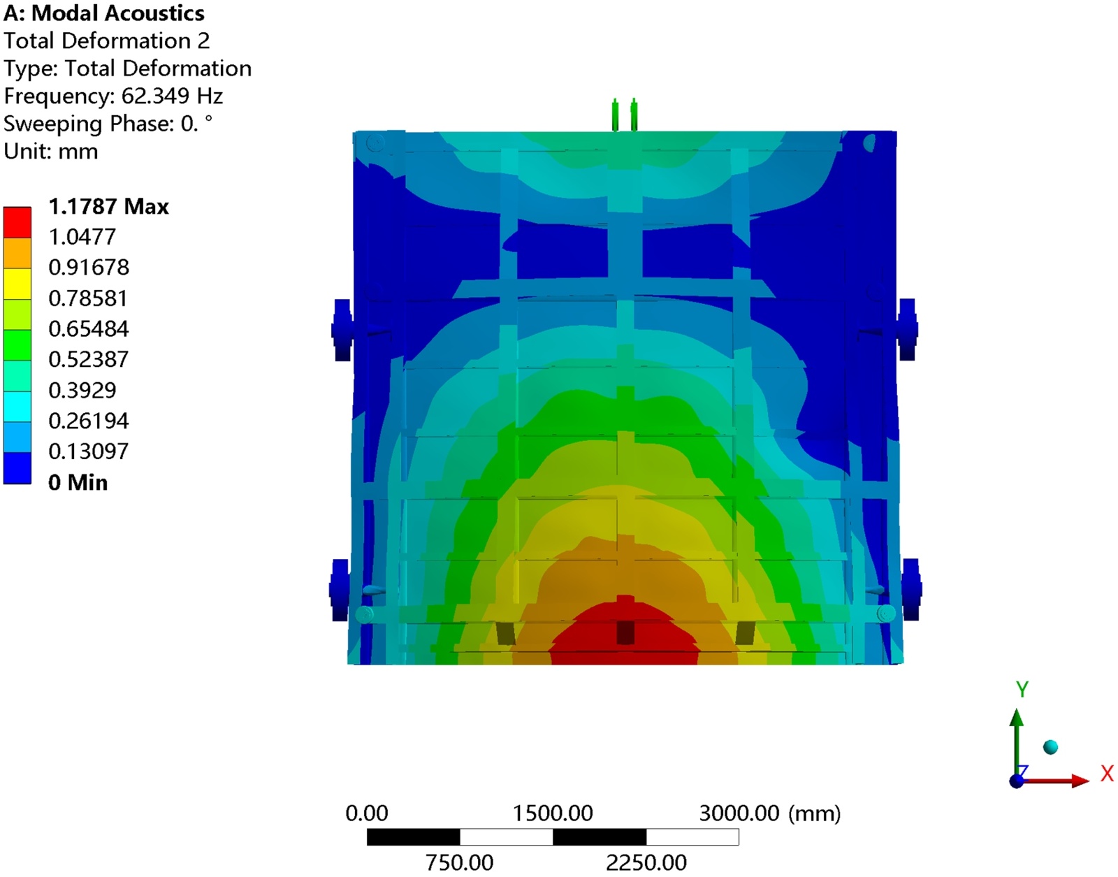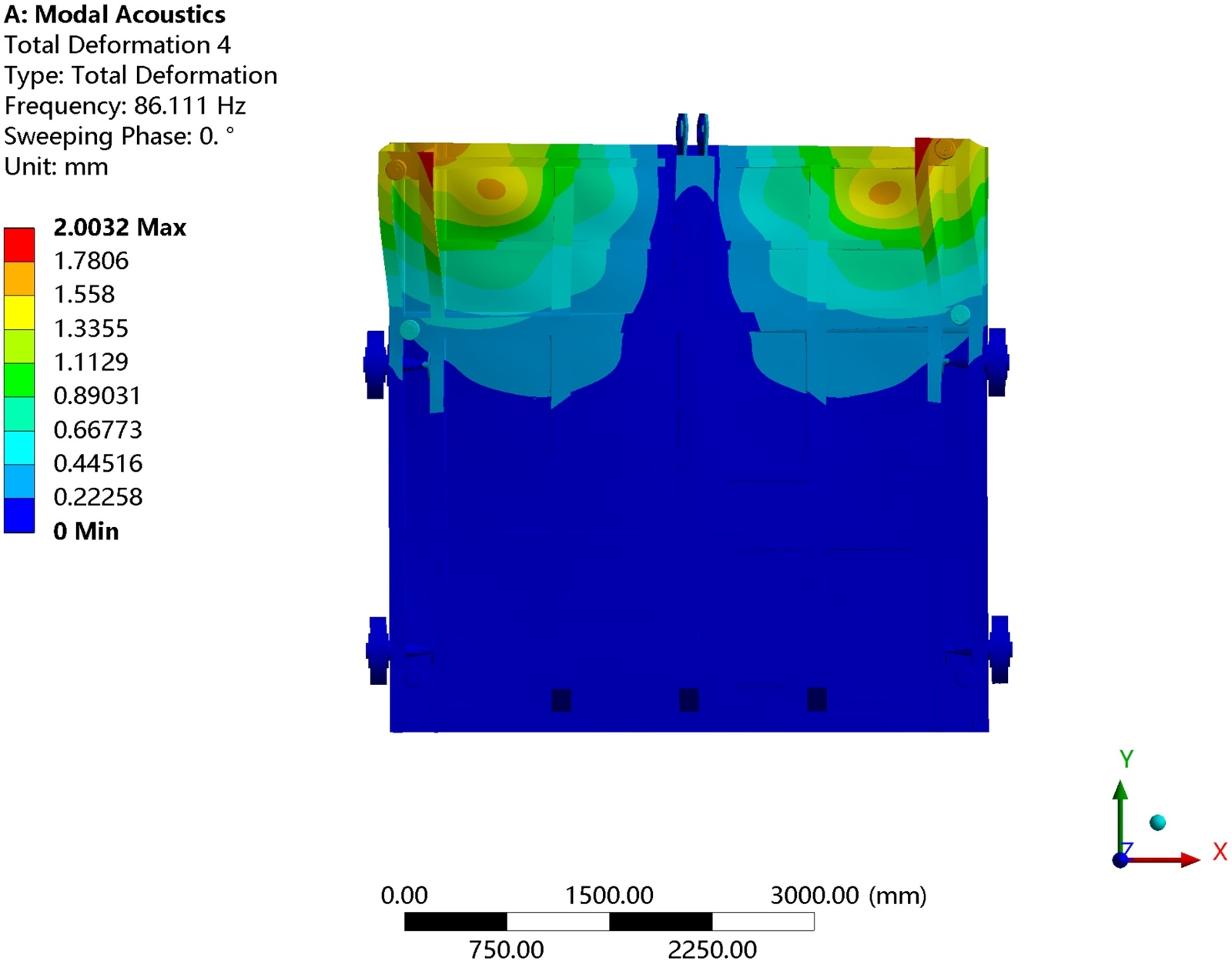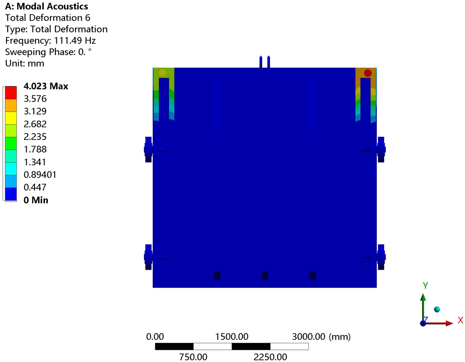 闸门在实际工作中,通常处于挡水工况,而水流与门体的相互作用会影响闸门的固有振动特性,为研究平面定轮钢闸门闸前有水时的振动问题,进行湿模态仿真分析。由于水流为液体,门体为固体,闸门在挡水时为流固耦合问题,首先需要enclosure水域,结合实际工作,本工程模拟单侧挡水工况,面板设置在上游,因此流体域位于面板侧,由表1可知,孔口宽度为4.2 m,闸门宽度为4.38 m,但模拟的闸门止水型式采用Y-L型前止水,因此液体作用的最大宽度为孔口宽度,作用高度为最高挡水位4 m。并定义水的特性,其密度为1000 kg/m3,声速为1400 m/s,闸门整体为physics region,水为acoustics region。由于模拟闸门的运行工况相同,边界条件、闸门的网格划分、材料定义等设置与静水压力分析保持一致,钢闸门的前六阶湿模态如图12所示。
