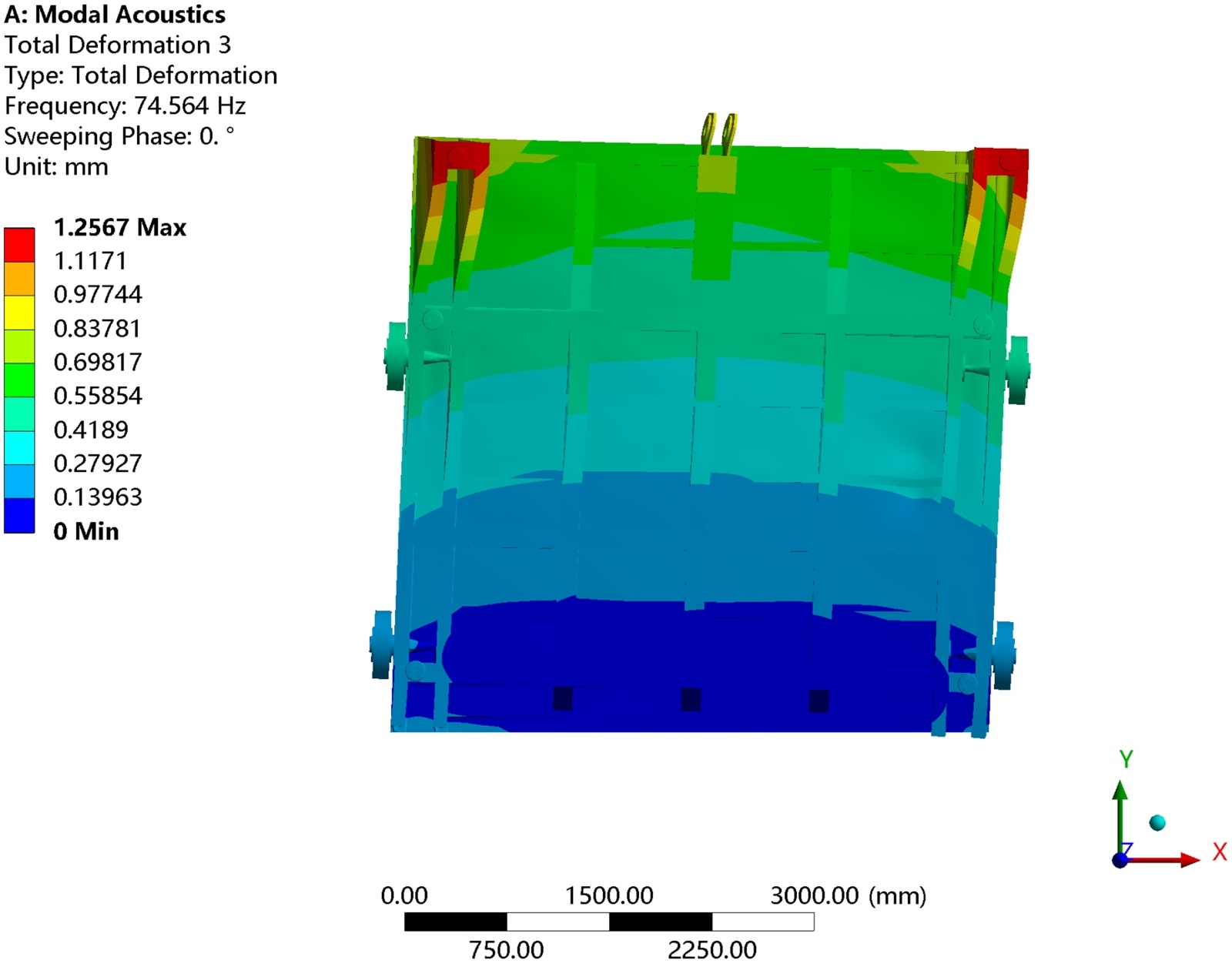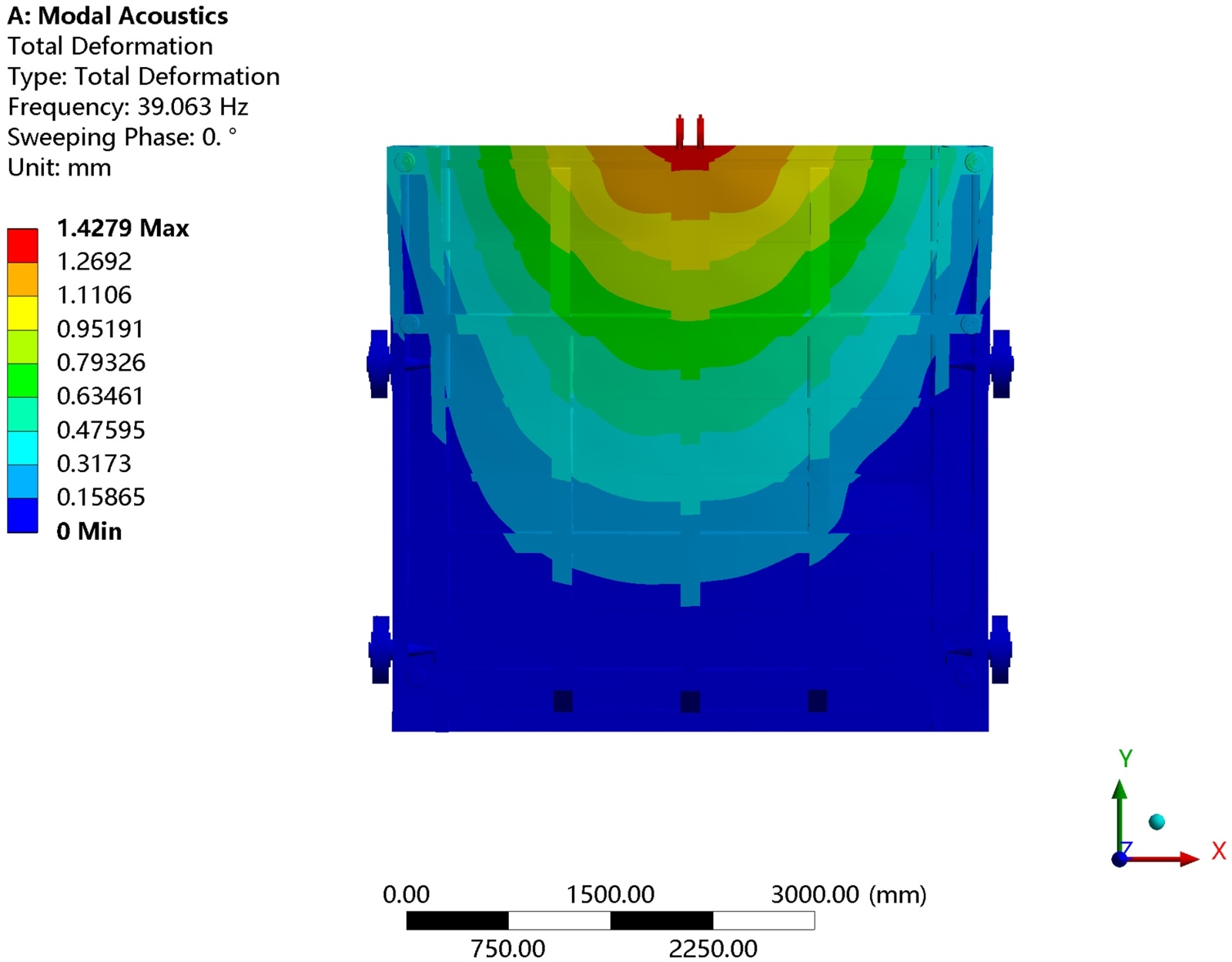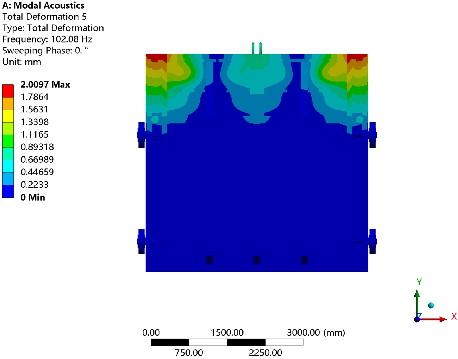 闸门在实际工作中,通常处于挡水工况,而水流与门体的相互作用会影响闸门的固有振动特性,为研究平面定轮钢闸门闸前有水时的振动问题,进行湿模态仿真分析。由于水流为液体,门体为固体,闸门在挡水时为流固耦合问题,首先需要enclosure水域,结合实际工作,本工程模拟单侧挡水工况,面板设置在上游,因此流体域位于面板侧,由表1可知,孔口宽度为4.2 m,闸门宽度为4.38 m,但模拟的闸门止水型式采用Y-L型前止水,因此液体作用的最大宽度为孔口宽度,作用高度为最高挡水位4 m。并定义水的特性,其密度为1000 kg/m3,声速为1400 m/s,闸门整体为physics region,水为acoustics region。由于模拟闸门的运行工况相同,边界条件、闸门的网格划分、材料定义等设置与静水压力分析保持一致,钢闸门的前六阶湿模态如图12所示。