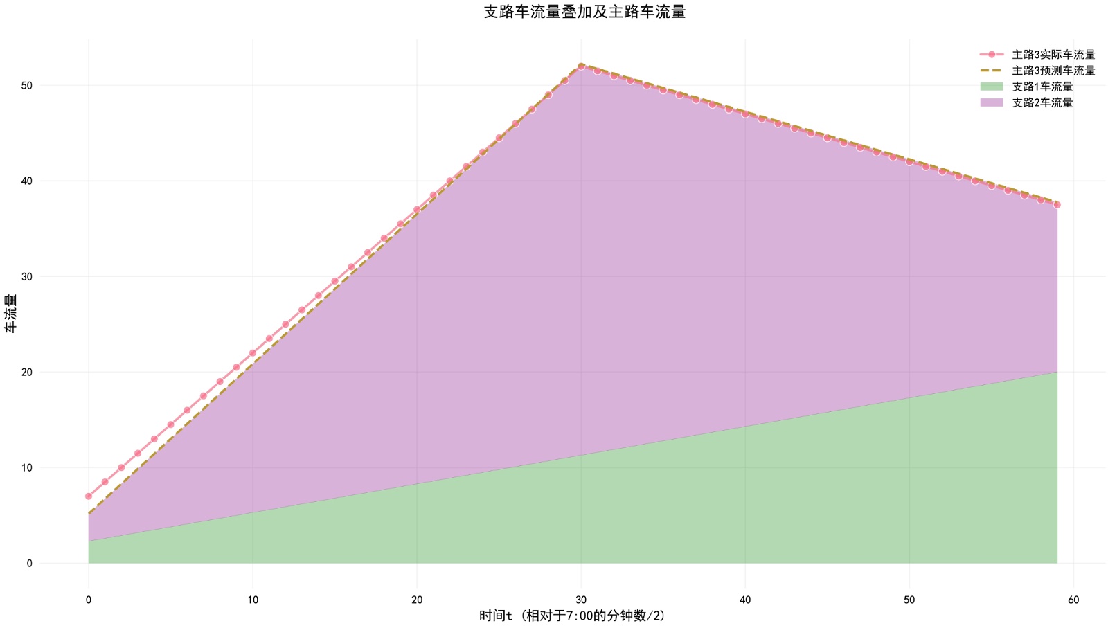 进一步,对观测数据进行可视化与分析(见图2)可知,主路3及其两条关联支路的车流量呈现出鲜明的动态特征。在60分钟观测期内,主路3的实际车流量(粉色虚线)与预测车流量(橙色虚线)高度吻合,均展现出显著的波峰形态。流量从初始约20辆稳步上升,在30分钟时达到峰值约50辆,随后缓慢下降至约38辆。与此同时,两条支路的车流量表现为相对平缓且稳定的趋势。支路1车流量(浅绿色区域)以较低的基数缓慢攀升,最终稳定在约5辆左右;支路2车流量(紫色区域)也呈现出相似的平缓上升态势,最终稳定在约10辆水平。该图清晰表明,主路3承载了区域内主要的交通负荷并呈现明显的时段性高峰,而支路1和支路2则作为次要路径,其流量水平显著低于主路且变化幅度较小,表现出更强的稳定性。