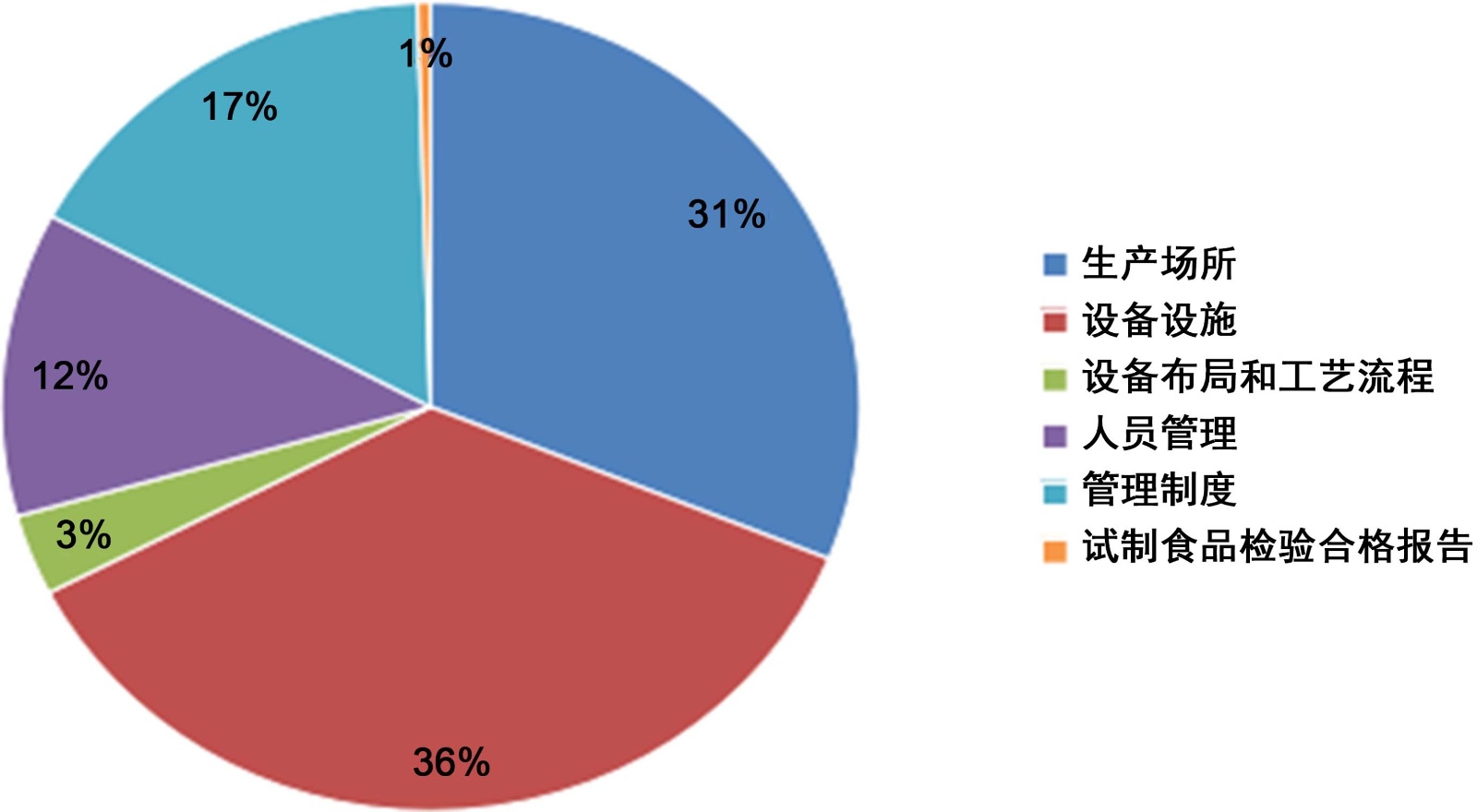 根据《食品、食品添加剂生产许可现场核查评分记录表》,34个核查项目分布于6个部分:生产场所(6项:1.1.1~1.3.2)、设备设施(12项:2.1.1~2.9)、设备布局和工艺流程(3项:3.1~3.2.2)、人员管理(3项:4.1~4.3)、管理制度(9项:5.1~5.9)、试制食品检验合格报告(1项:6.1)。将360本现场核查记录表中的问题项目进行统计(0分项、1分项或0.5分项),共有1635个条款,具体分布情况见图1。从图中可以看出,出现问题较多的部分为设备设施、生产场所、管理制度和人员管理,最少的为试制食品检验合格报告。
