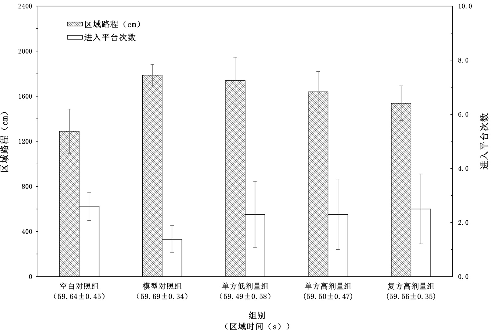 各剂量组与模型对照组相比,游泳路程均减少,单方呈线性量效关系,且复方制剂具有显著差异(p < 0.05),进入平台所在象限的次数均显著高于模型对照组(p < 0.05, p < 0.01)。