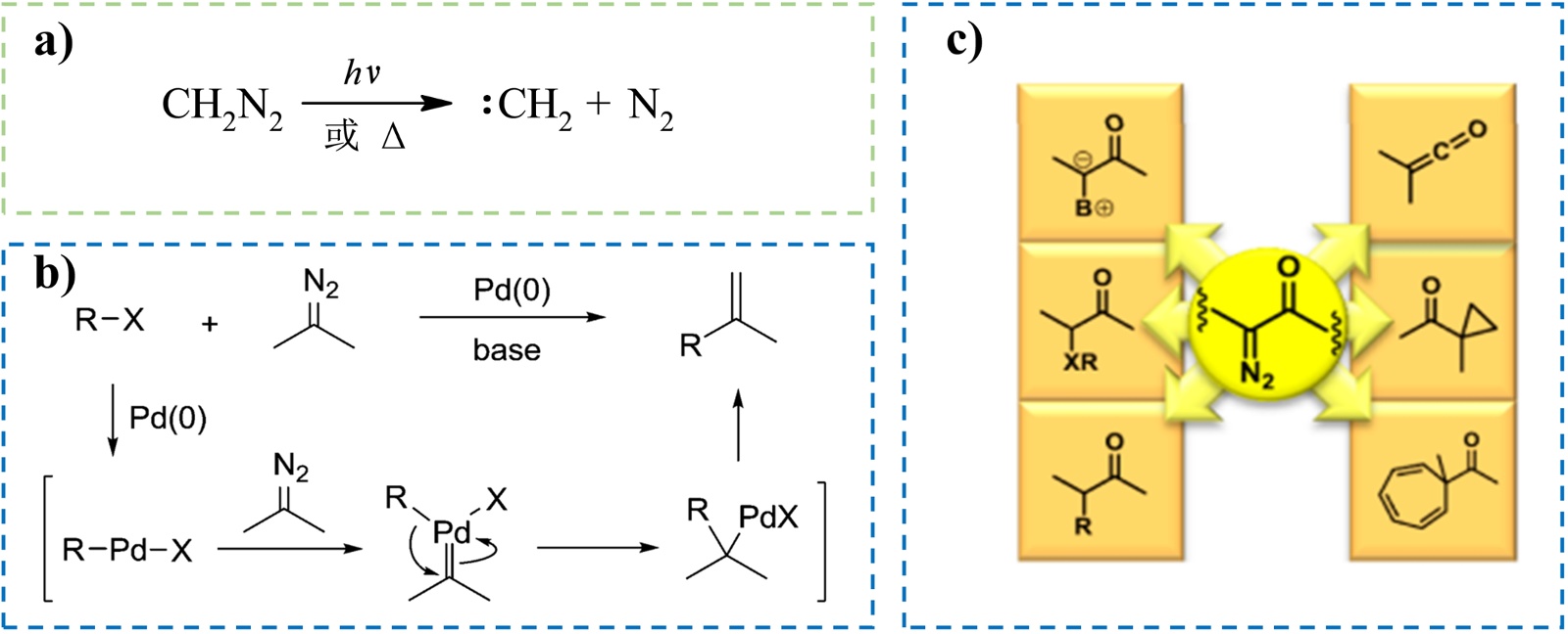 有机化学前沿进展中的重氮化合物作为氯仿或重氮甲烷的类似物,在有机合成领域中利用其产生的高活性碳烯中间体实现了碳氢键、碳杂键插入、wolff重排、环加成等一系列高效的新反应(见图2)。