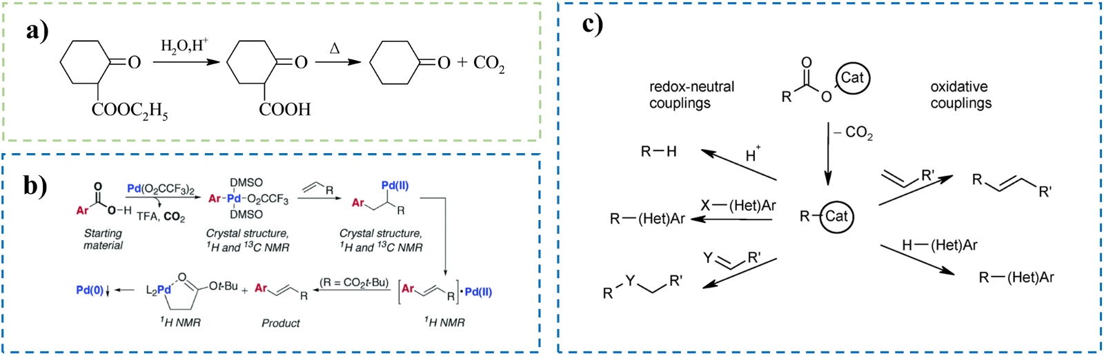 图4. (a) 脱羧反应;(b) 钯催化芳基羧羧与烯烃的偶联反应;(c) 金属催化脱羧偶联综述