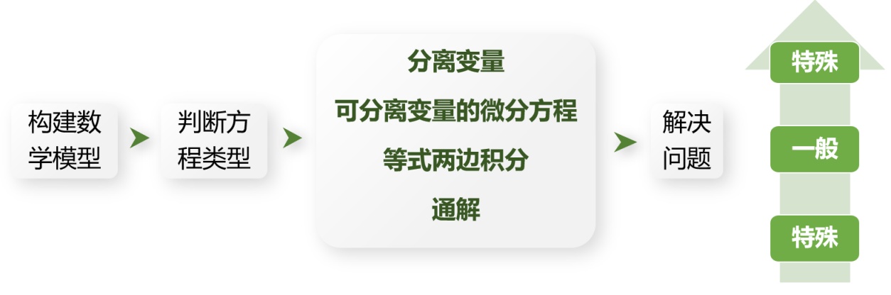 和学生一起回顾整个案例解决过程,从分析案例构建数学模型,发现模型是一个微分方程,而且是可分离变量的微分方程,通过逐层求解,总结出求通解的一般方法(变量分离–两边积分–通解)。整个案例的解决思路也适用于类似的题目,从而让学生意识到数学中也存在从特殊到一般再到特殊的哲学思想,见图3。