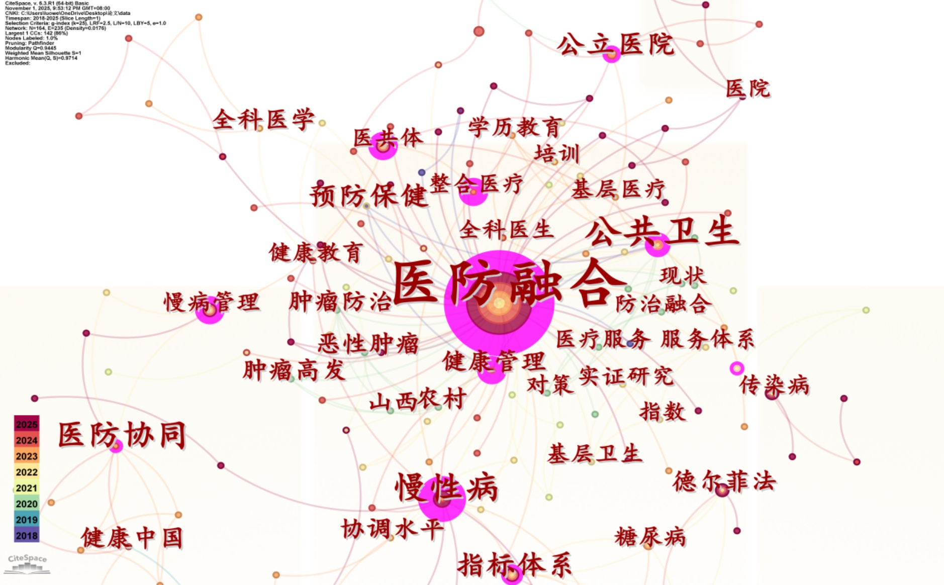 本文数据来源于中国知网(CNKI)网络出版总库,选择来源北大期刊、中文社会科学引文索引(CSSCI)、CSCD、AMI数据库收录文献,这几类期刊代表了国内具有较高影响力的高质量期刊。在CNKI数据库中,以主题词“医防融合”进行检索,共计检索得到文献874篇。为保证数据的准确性和科学性,手动剔除新闻报道、会议摘要、征稿等,经过清洗数据,共计检索得到文献164篇,检索时间跨度为2018~2025年,检索时间为2025年10月25日。