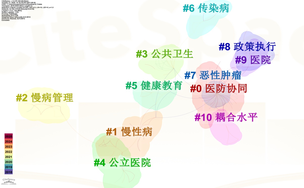 Abstract: To sort out the development context, core subjects and hot directions of domestic research on the integration of medical treatment and prevention, also in order to make up for the systematic deficiency of previous studies mainly focusing on the sorting and interpretation of subjective content, this paper takes 164 high-quality literatures in the field of the integration of medical treatment and prevention included in China National Knowledge Infrastructure (CNKI) from 2018 to 2025 as the research objects. The CiteSpace 6.3.R1 software was used to draw the co-occurrence graph of keywords and the visible graph of keyword clustering to achieve visual analysis. The focus was on exploring the temporal characteristics of publication, the core author network, the distribution of research institutions, and the co-occurrence and clustering patterns of keywords. The results show that the research enthusiasm for the integration of medical treatment and prevention in China is in a trend of “steady start-rapid growth-high activity”. It entered a period of explosive growth after 2022, with 46 papers published from 2024 to 2025, significantly driven by the “Healthy China” strategy and public health demands. The intensity of scientific research cooperation among core authors is relatively weak, with the cumulative proportion of published papers being only 20.73%, the stable research team has not yet been formed. The research institutions are mainly universities, with disciplines concentrated in public health and preventive medicine. The geographical distribution shows the characteristics of “eastern region is concentrated while the central and western regions are scattered”. Keyword clustering has identified four core research hotspots, the collaborative management of chronic diseases and public health, the integration of medical treatment and prevention collaboration mechanisms and systems, the practical paths of public hospitals and medical communities, and the analysis of infectious disease prevention and control and policy implementation. This study provides objective academic support for the research on the integration of medical treatment and prevention through knowledge graphs. At the same time, it points out the deficiencies of current research in aspects such as the optimization of micro-service processes, cross-regional cooperation, and the deepening of digital technology paths, it provides references for the optimization of subsequent research directions.
