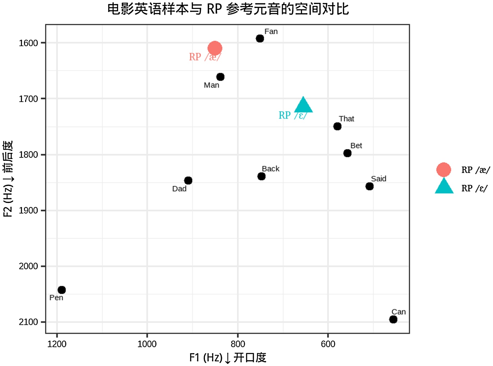 对比结果显示,电影语料中的大多数/æ/样本其F1值低于标准英音中的典型值,而其F2值更偏向前方,更接近/ɛ/的区域。整体来看,相比标准英音,电影语料中两类元音的边界明显弱化,音质差异缩小。