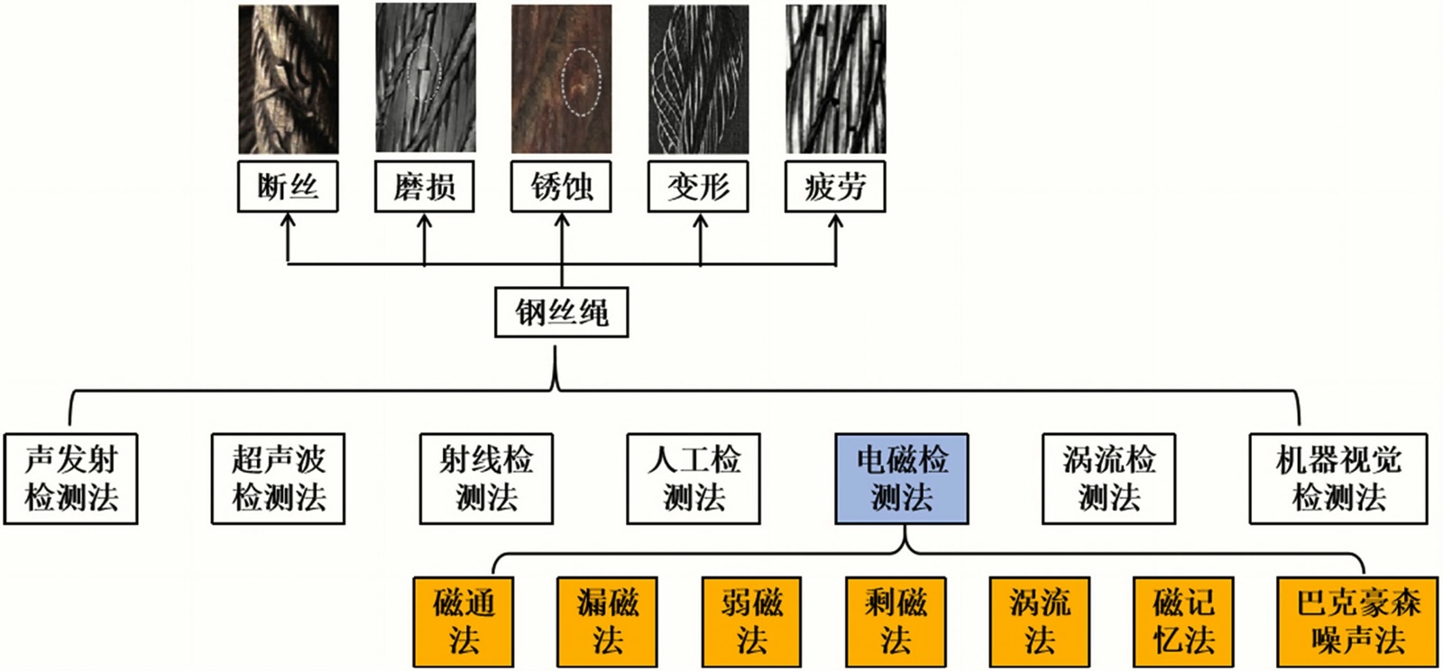 如图2所示,电磁检测法基于电磁感应原理,利用钢丝绳铁磁性的特性,通过励磁装置将钢丝绳磁化至饱和状态。当钢丝绳存在断丝、磨损、锈蚀等损伤时,磁路完整性被破坏,会在损伤处产生漏磁场。通过磁敏传感器捕捉漏磁场信号,经信号处理与分析,实现损伤识别、定位与定量评估。根据检测参数不同,电磁检测法可分为漏磁检测法、主磁通检测法等,其中漏磁检测法应用最广泛。