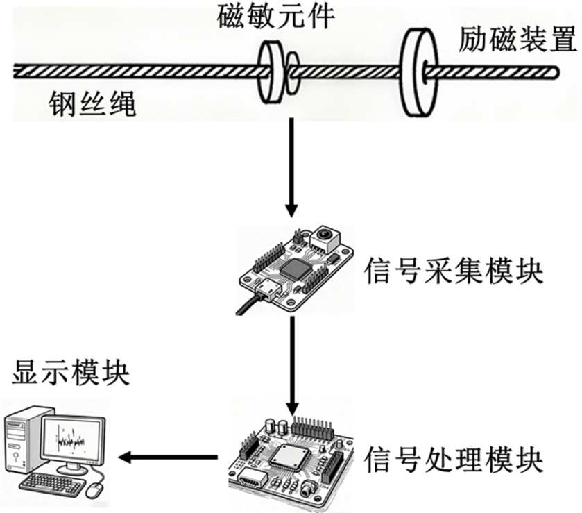 Zhou Z.等提出基于多阶段励磁原理的钢丝绳断丝检测装置,通过优化励磁线圈布局,增强对微小断丝的识别能力。杨叔子院士团队提出基于漏磁信号的断丝定量识别方法,通过小波变换、自适应滤波等算法提取损伤特征,实现断丝数量与位置的精准识别;战卫侠采用短时峭度法处理漏磁信号,有效抑制噪声干扰,提升弱损伤信号检测能力,损伤定位误差小于0.5%;郭永亮开发基于漏磁检测的钢丝绳断丝在线检测系统,集成励磁、信号采集、数据处理功能,实现工业现场实时检测,检测准确率达95%以上[1]-[12]。