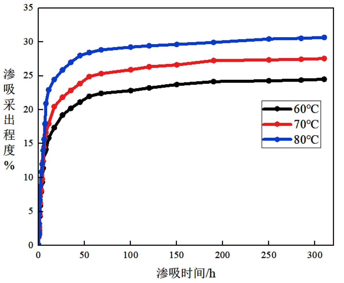 图1. 不同温度下的渗吸采出程度