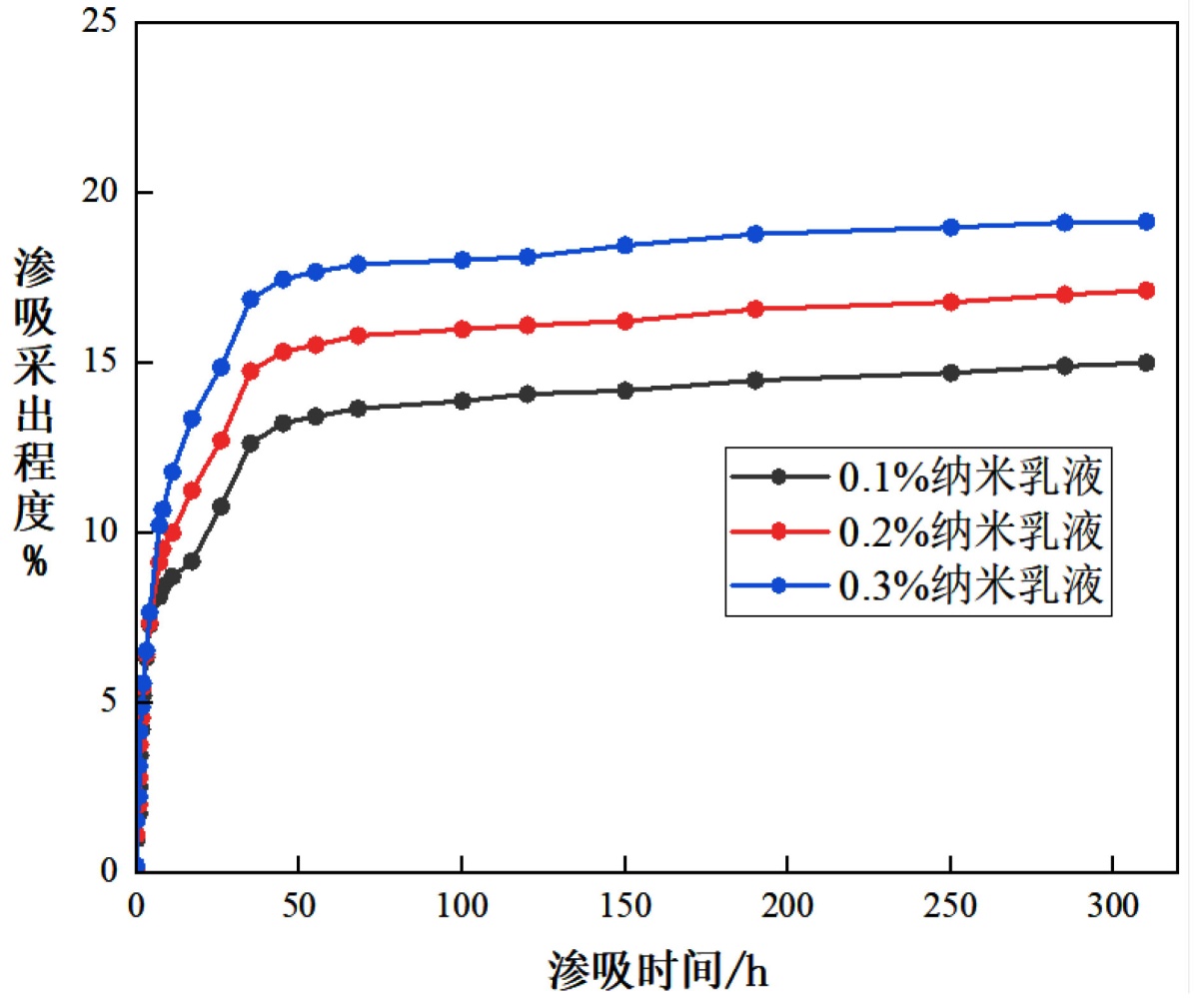 图2为在不同浓度下的纳米乳液渗吸驱油曲线(0.1%, 0.2%, 0.3%),从图2中可知:加入0.1%浓度的纳米乳液,岩心渗吸采出程度为14.98%;加入0.2%浓度的纳米乳液,岩心采出程度为17.16%;加入0.3%浓度的纳米乳液,岩心采出程度达到19.25%。当纳米乳液浓度为0.3%时,岩心前期渗吸驱油效率最快,最终采出程度最高;浓度为0.2%时次之;当浓度为0.1%时,岩心前期驱油效率最慢,最终采出程度最低。0.3%浓度的纳米乳液比0.1%浓度的纳米乳液最终采出程度提高了2%。结果表明:随着纳米乳液浓度的提高,岩心的渗吸速率、效率都有明显提高。纳米乳液浓度越高,岩心前期的渗吸速率越快,渗吸效率越高。浓度影响的核心机理与表面活性剂的界面行为及胶体特性密切相关:通过界面张力测试实验证实,纳米乳液浓度低于临界胶束浓度(CMC = 0.013%)时,界面张力随浓度升高急剧下降;当浓度高于CMC后,界面张力下降趋缓,但表面活性剂分子形成的胶束结构可进一步强化乳化与润湿反转效果。0.1%~0.3%的实验浓度均高于CMC,此时浓度升高使油–水界面张力从0.1%时的5.8 mN/m降至0.3%时的2.3 mN/m,超低界面张力状态下原油更易被乳化分散为微小油滴(粒径从0.1%浓度时的80 nm降至0.3%浓度时的45 nm),便于通过岩心微小孔隙排出;同时,接触角测量显示,0.3%浓度时岩心接触角降至89˚,润湿性显著改善,这是由于高浓度纳米乳液中更多的表面活性剂分子吸附于岩石表面,形成致密的吸附膜,替换了原本吸附的原油组分,实现了从油湿向中性润湿性的转变;此外,高浓度纳米乳液的粘度略高于低浓度体系(0.3%浓度时粘度为3.2 mPas,0.1%浓度时为2.5 mPas),适当提高的粘度可降低窜流风险,延长纳米乳液与岩心的接触时间,进一步发挥乳化携带与调剖作用,从而同步提升渗吸速率与最终采出程度。