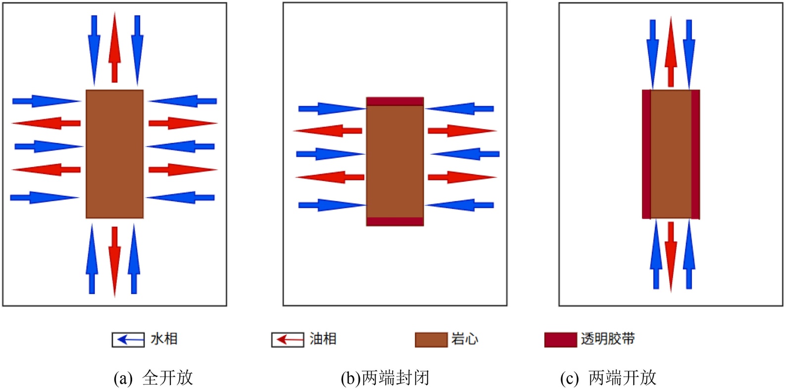 (4) 探究边界条件对于渗吸驱油的影响:一块岩心全开放,另一块岩心用胶带封住两端。分别放入渗吸瓶中,其他条件不变。记录排出油量,分析边界开放条件对渗吸驱油的影响。