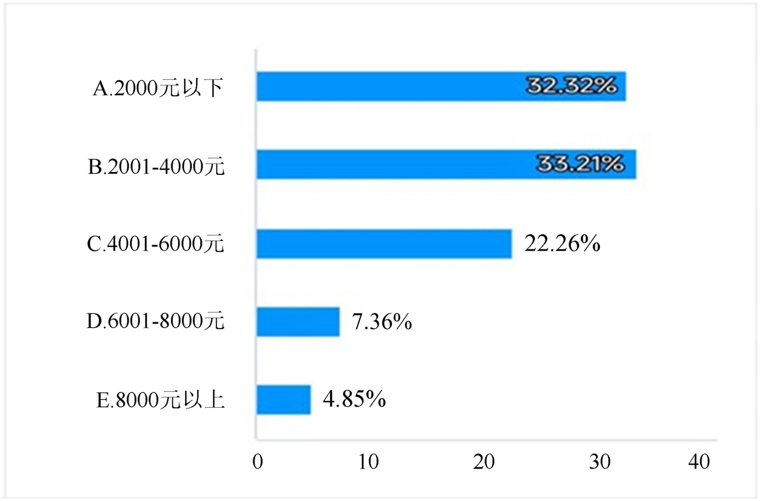 月收入水平:见图1,其中2001~4000元占比最大,为33.21%,其次为2000元以下,占比32.32%。