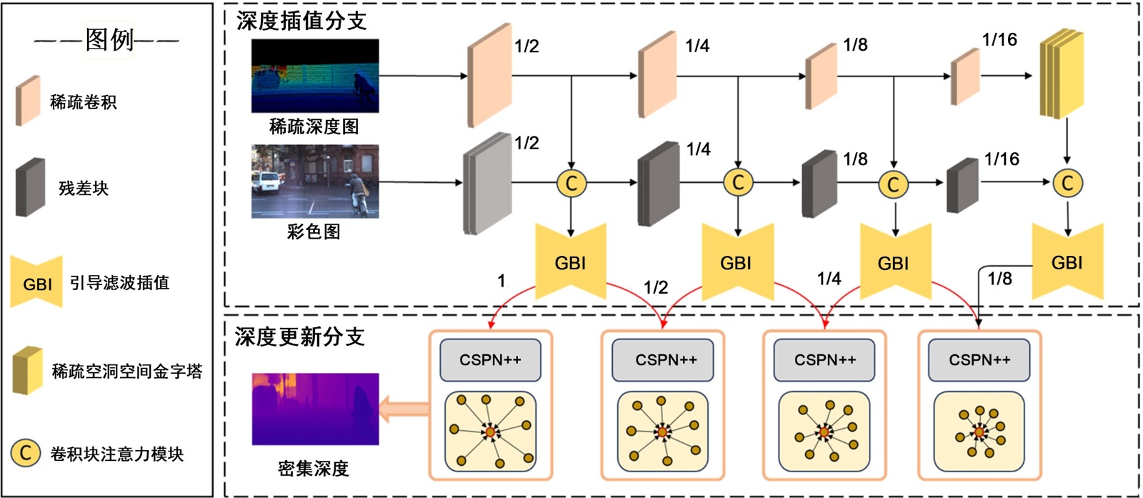 提出一种双分支多尺度深度补全网络,通过引导双边插值生成初始稠密深度,并结合CSPN++迭代优化,兼顾边界恢复与全局一致性;