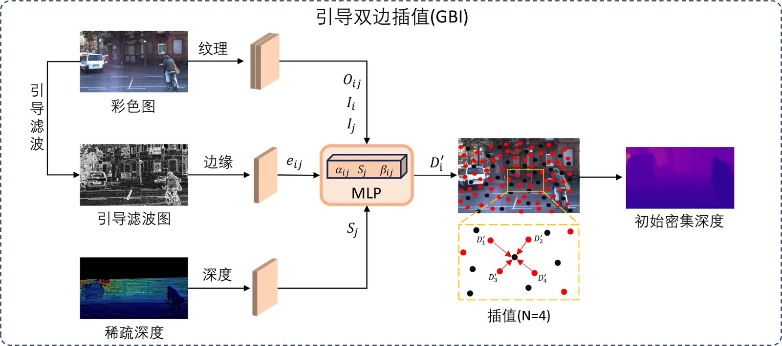 通过上述机制,引导双边插值利用引导滤波提取边缘特征的同时,有效融合稀疏深度的空间信息与彩色图像的纹理信息,从而在保持边缘结构一致性的前提下,提高了全局初始稠密深度的精度。