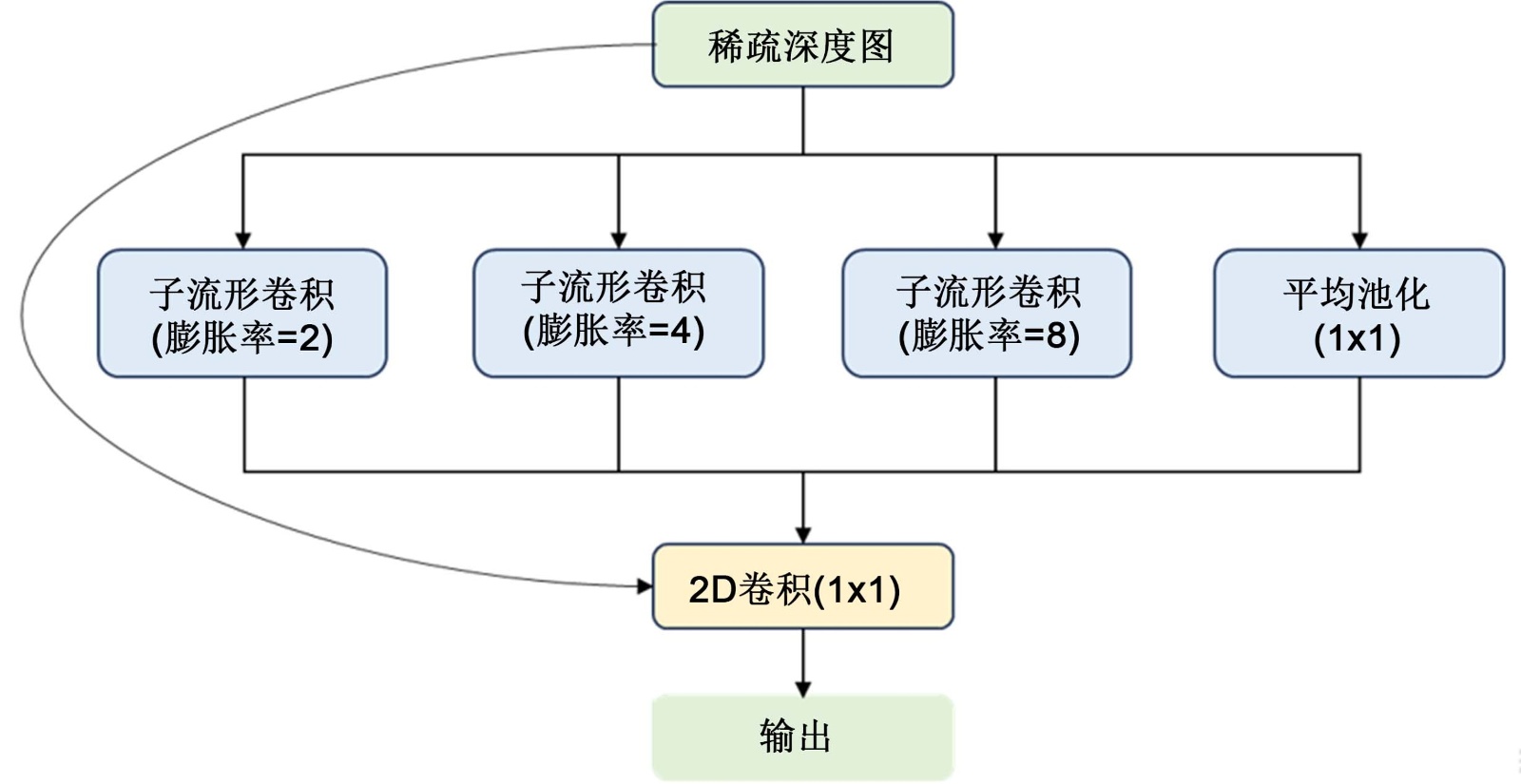 设计结合子流形稀疏卷积与空洞空间金字塔池化模块,将空洞空间金字塔池化模块中的普通卷积替换为相结合,有效增强稀疏深度的多尺度表征能力;