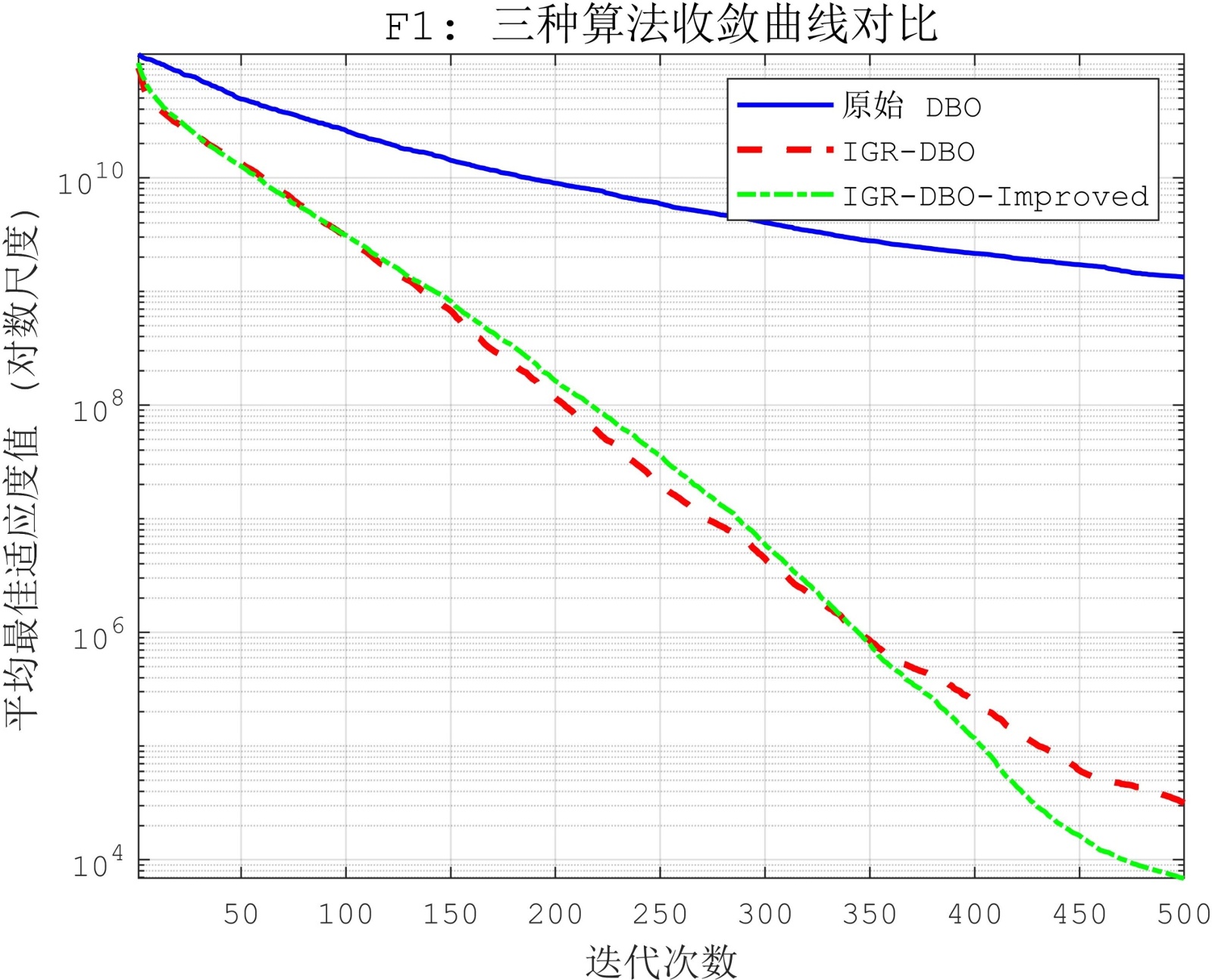 从表2数据和图1~9的可视化图来看,IDBO在大多数CEC-2017基准函数上表现出最优或接近最优的性能,其平均值和标准差均显著低于原始DBO和IGR-DBO。例如,在CEC2017-F1中,IDBO的平均值为6.486e+03,标准差为6.436e+03,而原始DBO的平均值高达1.330e+09,标准差为1.143e+02。这种差距表明IDBO在收敛精度和稳定性上具有显著优势。原始DBO作为基准算法,在大多数函数上的表现相对较差,尤其是在高维或复杂函数中。例如,CEC2017-F1和CEC2017-F12的平均值分别为1.330e+09和6.276e+07,标准差分别为1.143e+09和1.172e+08,显示出较大的波动性和较低的收敛精度。这可能与原始DBO缺乏有效的全局搜索机制和种群多样性维护策略有关,导致其容易陷入局部最优,尤其在面对高维优化问题时表现不佳。