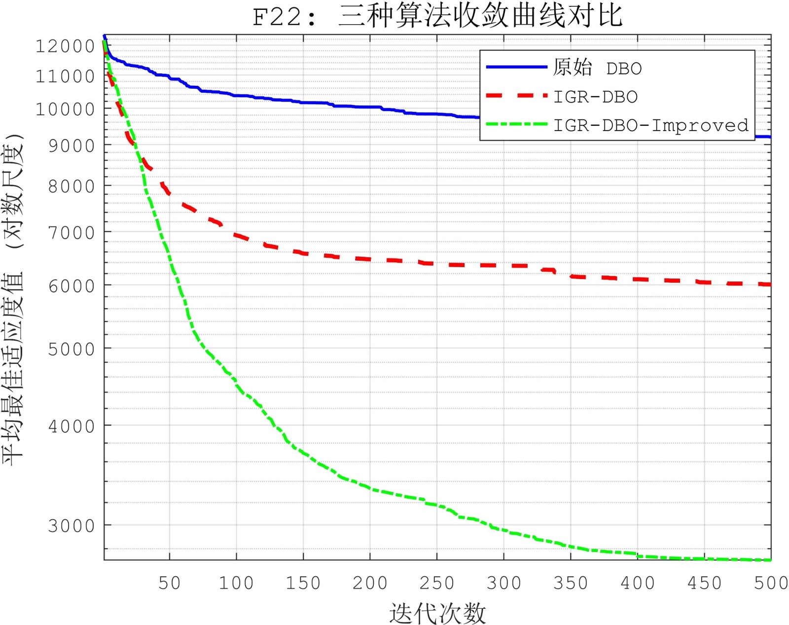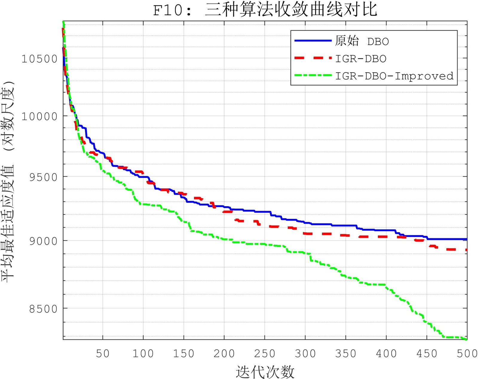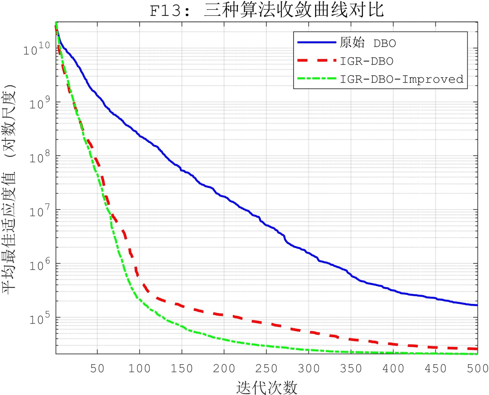 数据表明,IDBO和IGR-DBO的改进策略对原始DBO的性能提升起到了关键作用。IDBO的综合优化策略使其在收敛速度和精度上全面超越其他变体,而IGR-DBO的局部改进策略则在特定函数上表现良好。这与前文提到的增强策略(如全局探索和种群更新)相符,表明这些策略的有效性。然而,原始DBO的局限性也提示,单一算法框架在面对多样化优化问题时可能需要更多元化的改进。