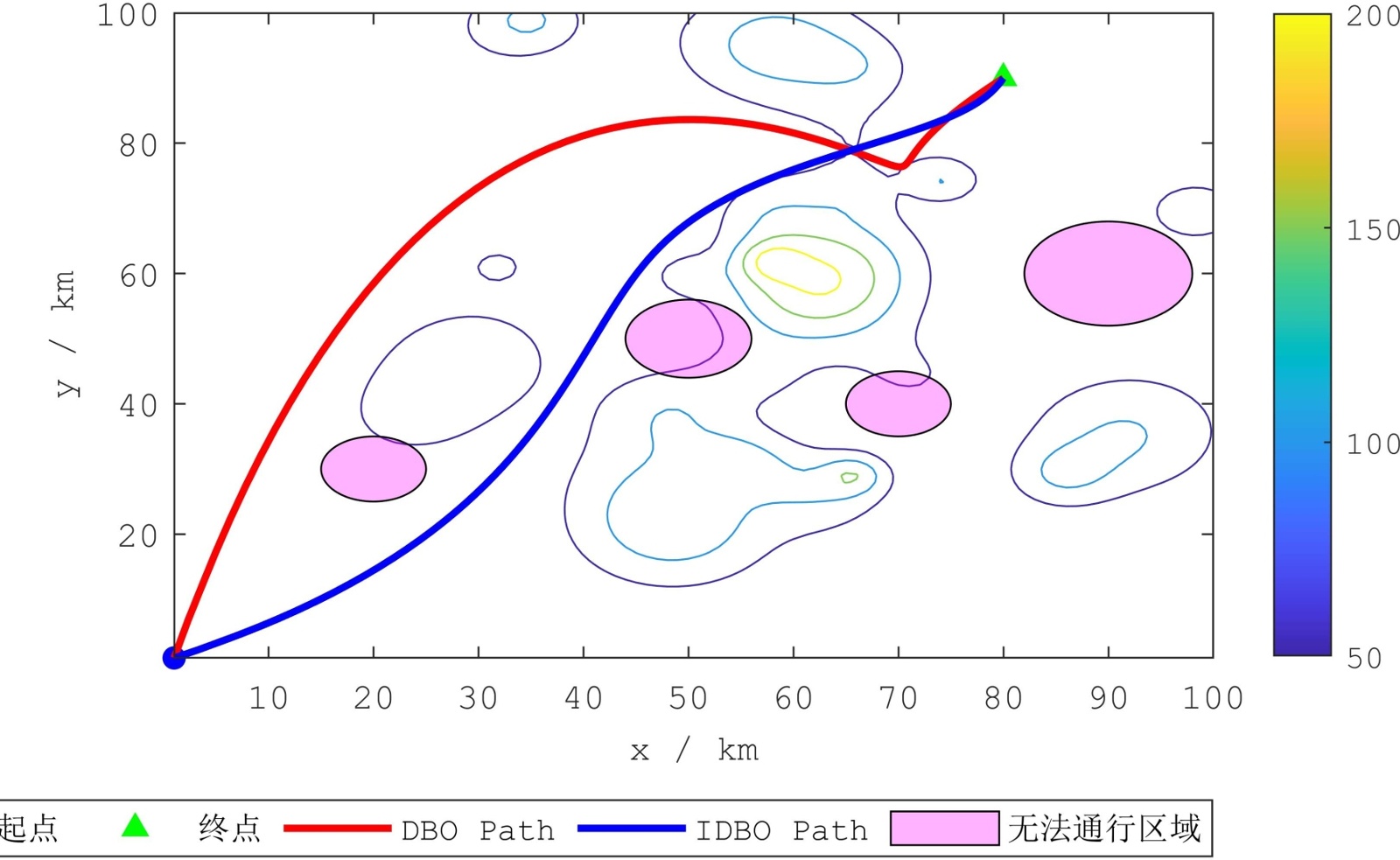 本节旨在探讨IDBO算法在实际场景中的应用潜力,特别聚焦于其在无人机三维轨迹规划中的表现。为验证其效能,我们对复杂山地地形下的无人机飞行路径进行了仿真实验。结果清晰展示了IDBO算法在处理高难度路径规划任务中的卓越能力,特别是在复杂环境下的导航表现,充分证明了其在该领域的实用性和可靠性。