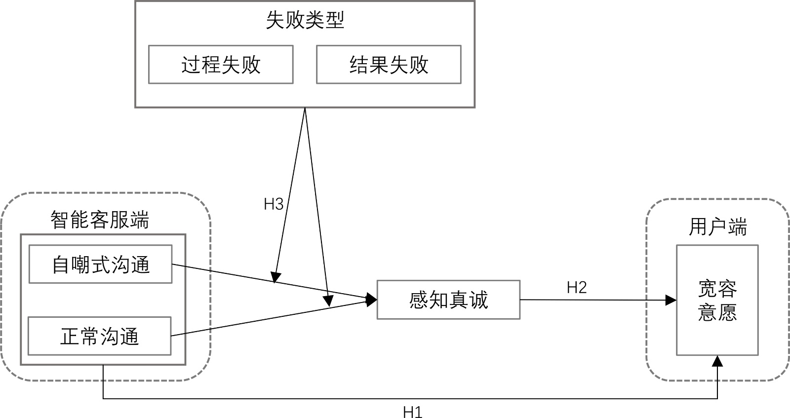 H1:在服务失败情形下,相比于正常沟通,用户在面对智能客服自嘲式沟通时,能够产生更高的宽容意愿。