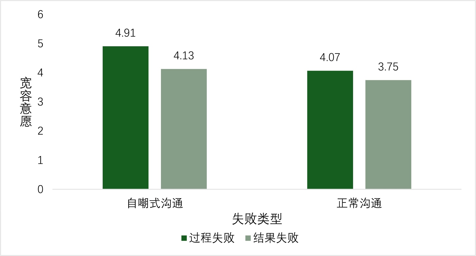 图3. 不同失败类型影响下,智能客服不同沟通策略下的用户宽容意愿