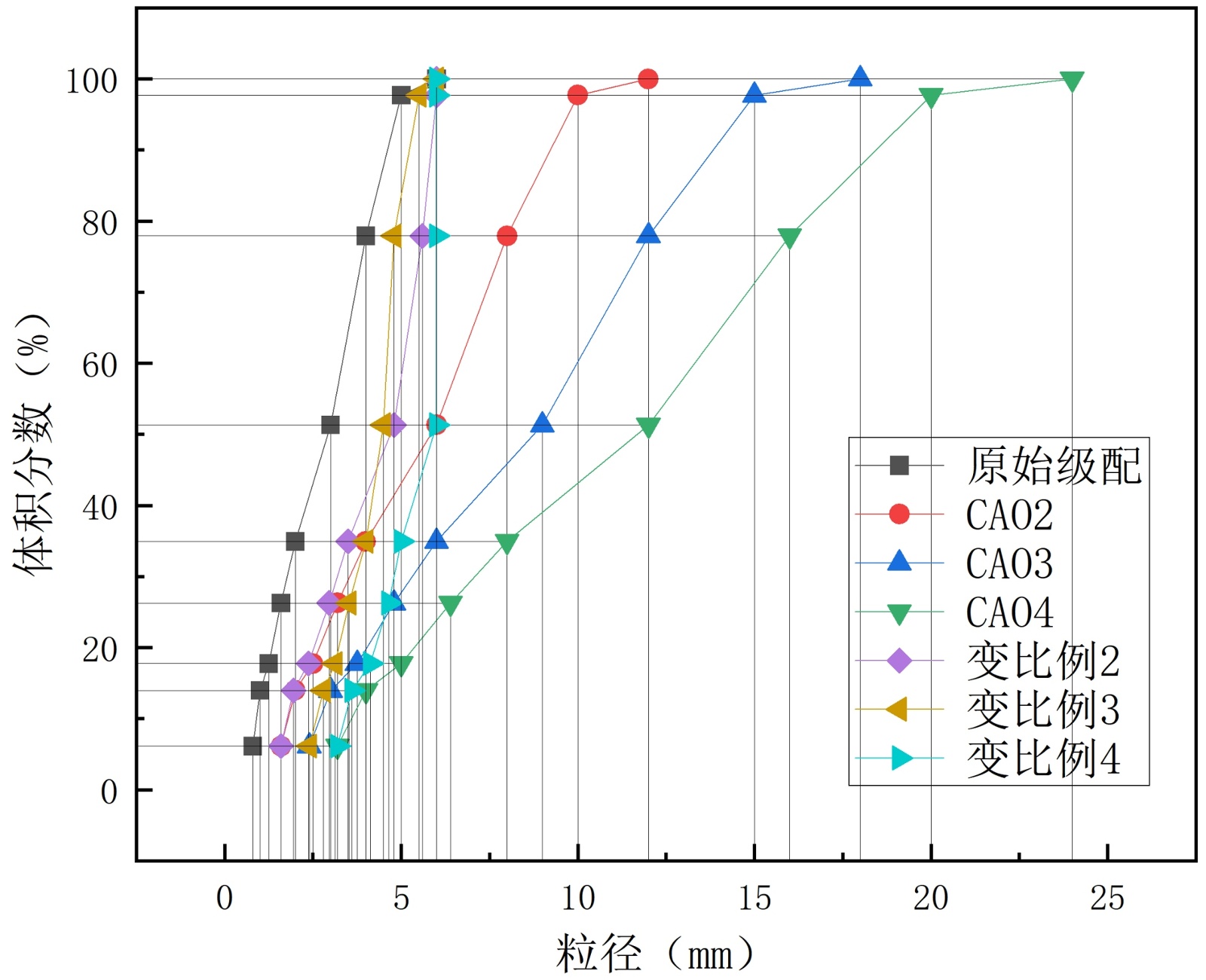 Figure 2. Grading diagram. Among them, CAO 2, CAO 3, and CAO 4 respectively represent the CAO models with coarse particle ratios of 2, 3, and 4; Variable Ratio 2, Variable Ratio 3, and Variable Ratio 4 respectively represent the variable ratio models with maximum coarse particle ratios of 2, 3, and 4