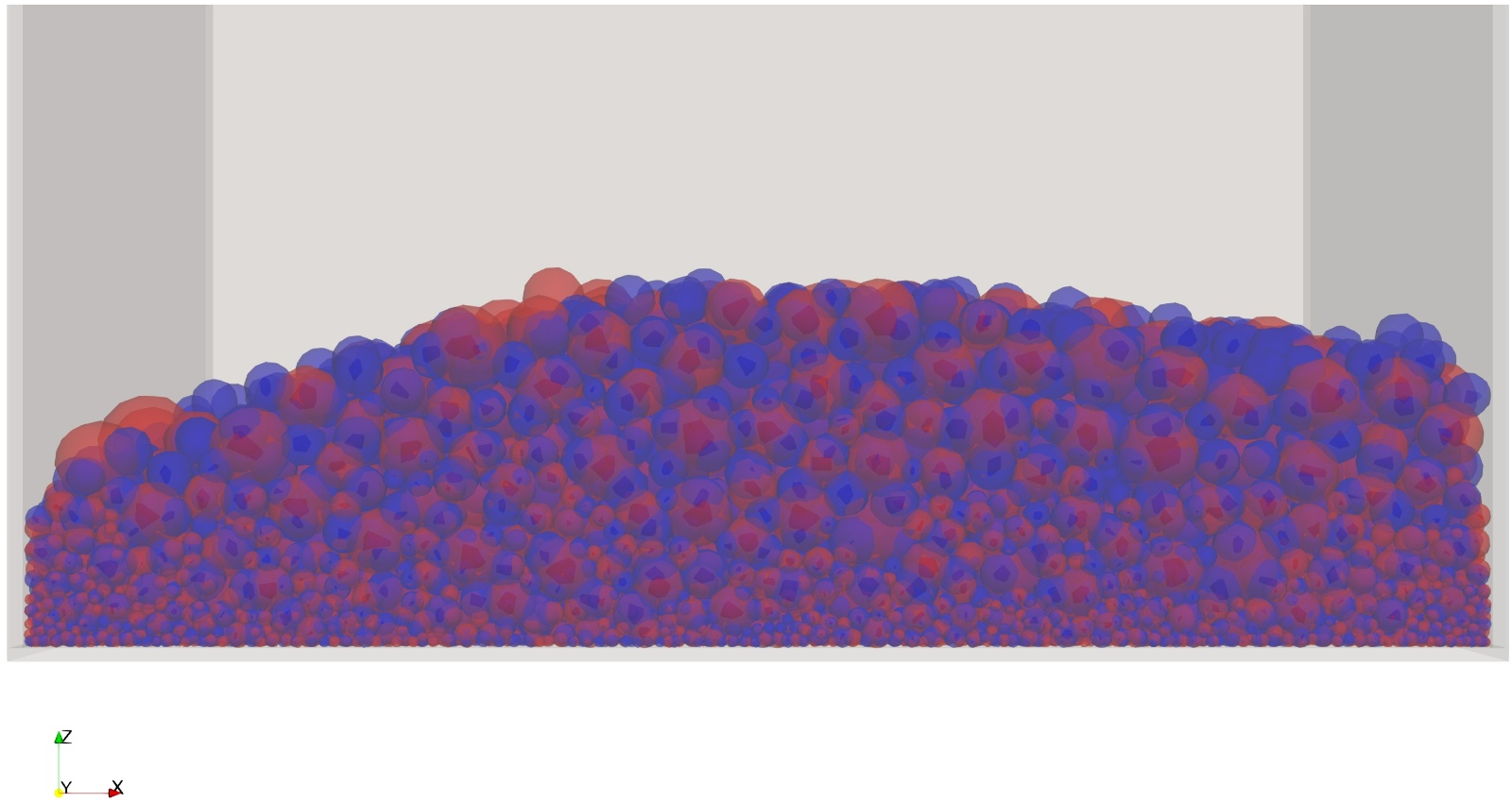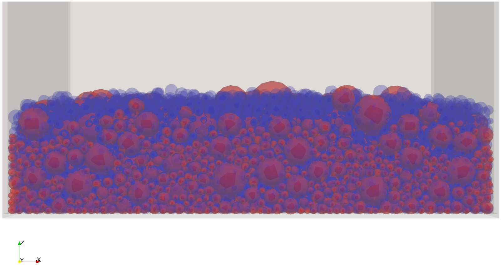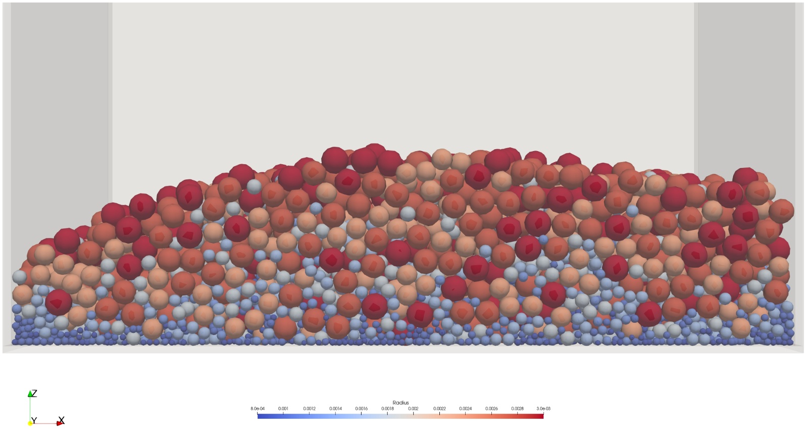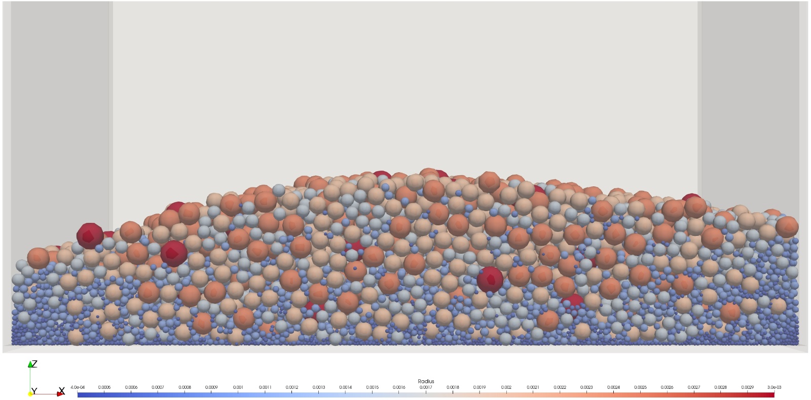原始级配模拟的颗粒级配如图2,模拟中共生成245,886个颗粒,计算总耗时112.6小时。颗粒在重力作用下落入沙箱中,待颗粒堆稳定后,颗粒堆高35.1 mm,如图3。震荡后颗粒堆上表面拟合为平面后得到平均堆高为26.5 mm,震荡后的形态如图3。