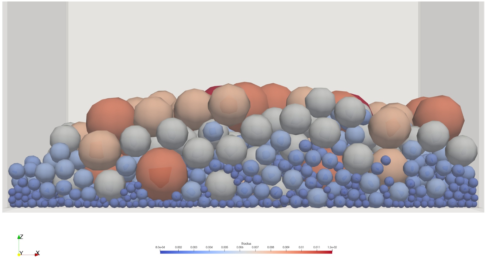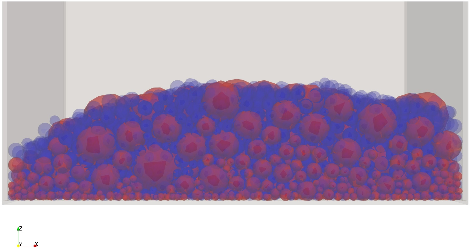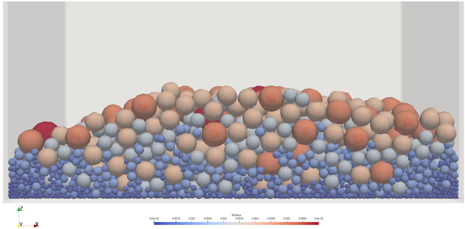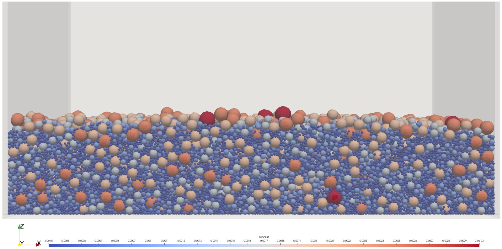 原始级配模拟的颗粒级配如图2,模拟中共生成245,886个颗粒,计算总耗时112.6小时。颗粒在重力作用下落入沙箱中,待颗粒堆稳定后,颗粒堆高35.1 mm,如图3。震荡后颗粒堆上表面拟合为平面后得到平均堆高为26.5 mm,震荡后的形态如图3。