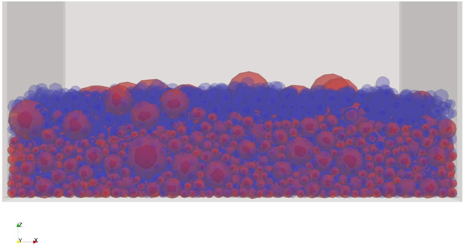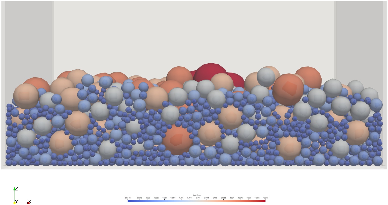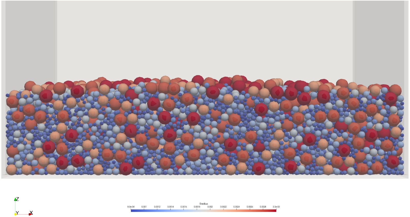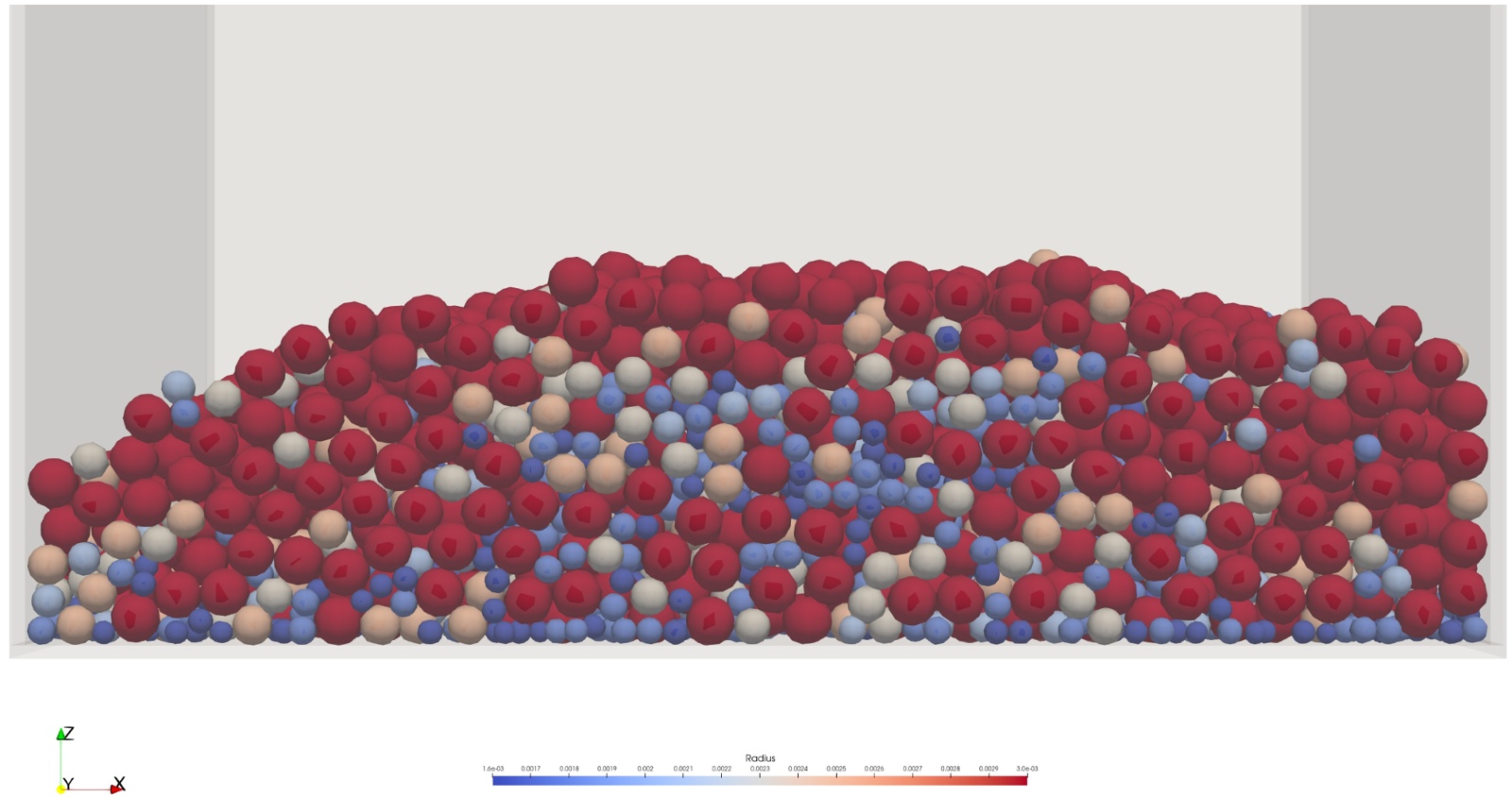 原始级配模拟的颗粒级配如图2,模拟中共生成245,886个颗粒,计算总耗时112.6小时。颗粒在重力作用下落入沙箱中,待颗粒堆稳定后,颗粒堆高35.1 mm,如图3。震荡后颗粒堆上表面拟合为平面后得到平均堆高为26.5 mm,震荡后的形态如图3。