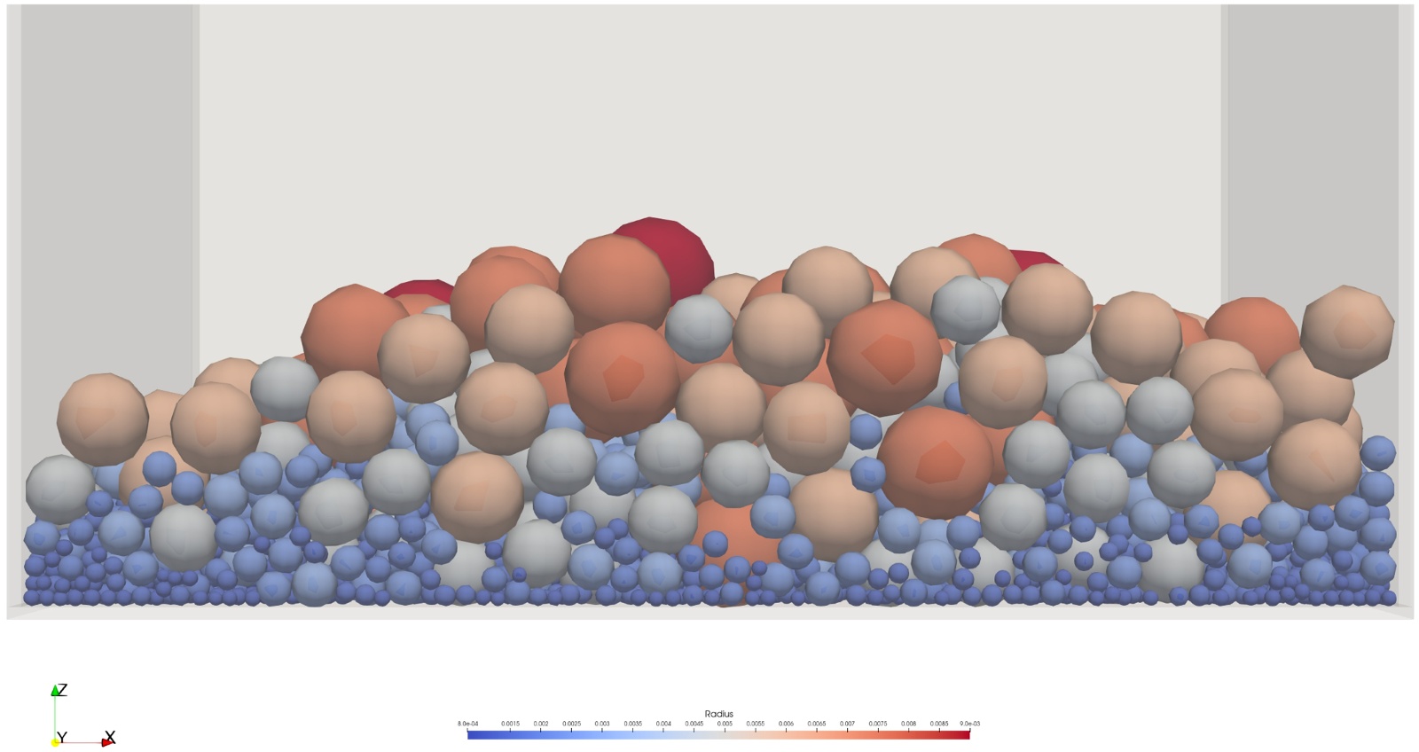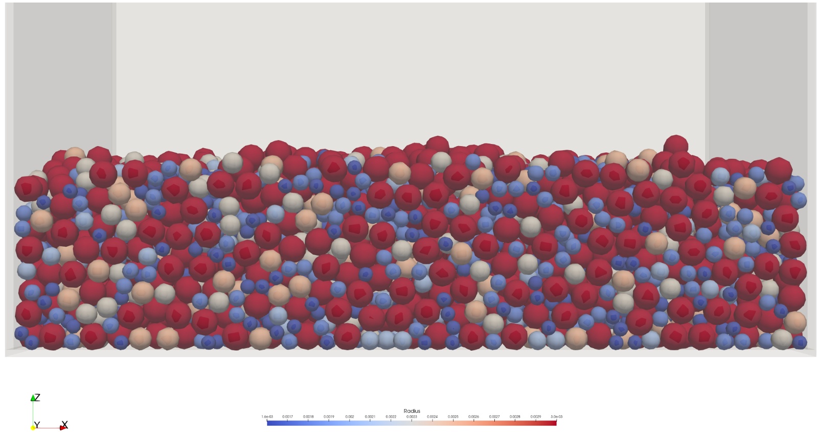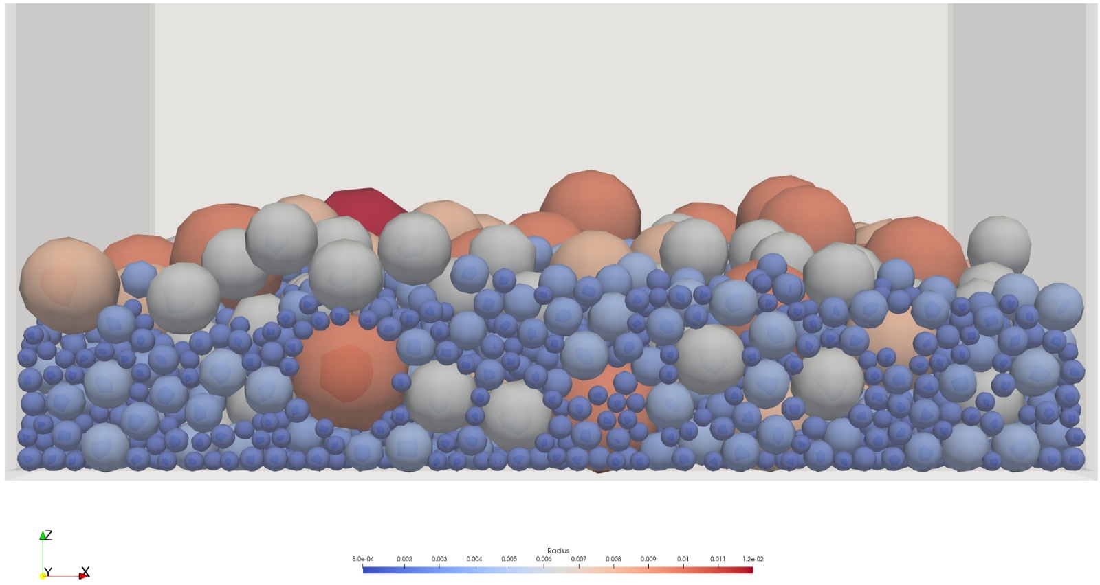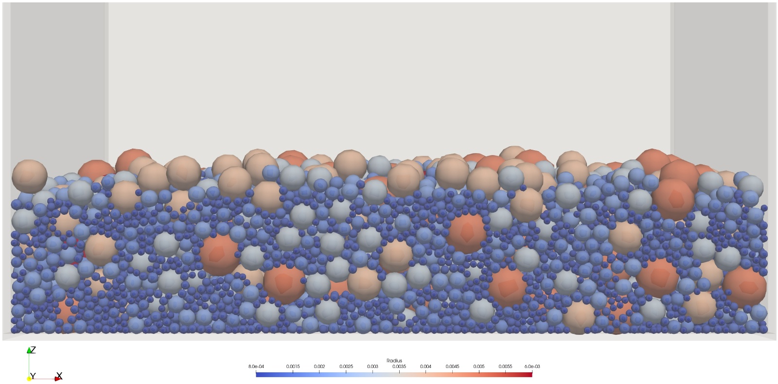 原始级配模拟的颗粒级配如图2,模拟中共生成245,886个颗粒,计算总耗时112.6小时。颗粒在重力作用下落入沙箱中,待颗粒堆稳定后,颗粒堆高35.1 mm,如图3。震荡后颗粒堆上表面拟合为平面后得到平均堆高为26.5 mm,震荡后的形态如图3。