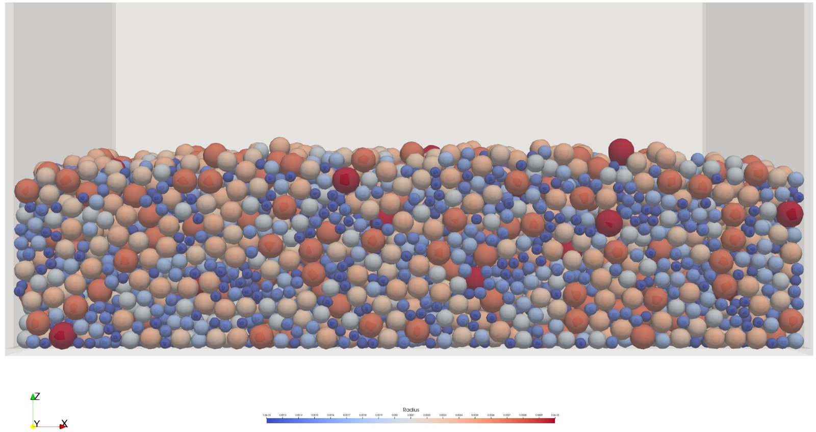 为3的沙箱震荡压实模拟。放大后的颗粒级配如图2,模拟中共生成10,196个颗粒,计算总耗时4.5小时。颗粒在重力作用下落入沙箱中,待颗粒堆稳定后,颗粒堆高35.8 mm,如图5。震荡后颗粒堆上表面拟合为平面后得到平均堆高为27.2 mm,震荡后的形态如图5。