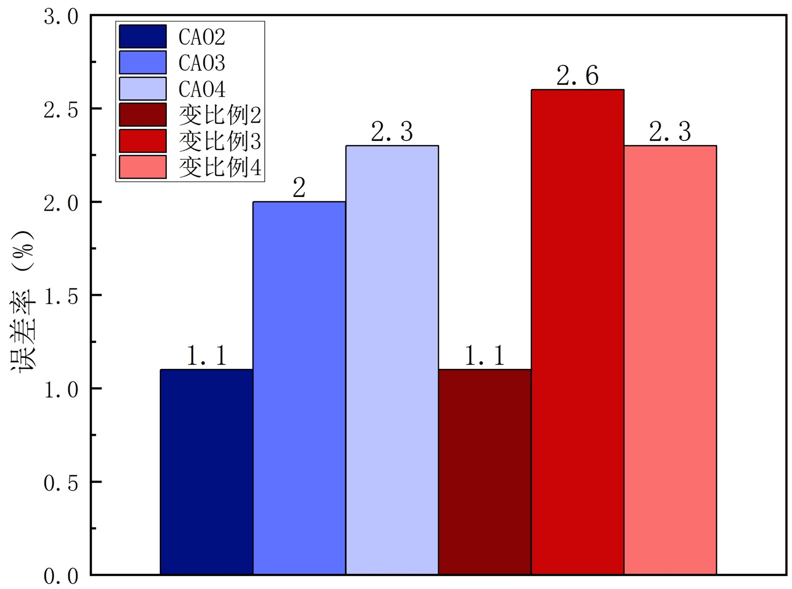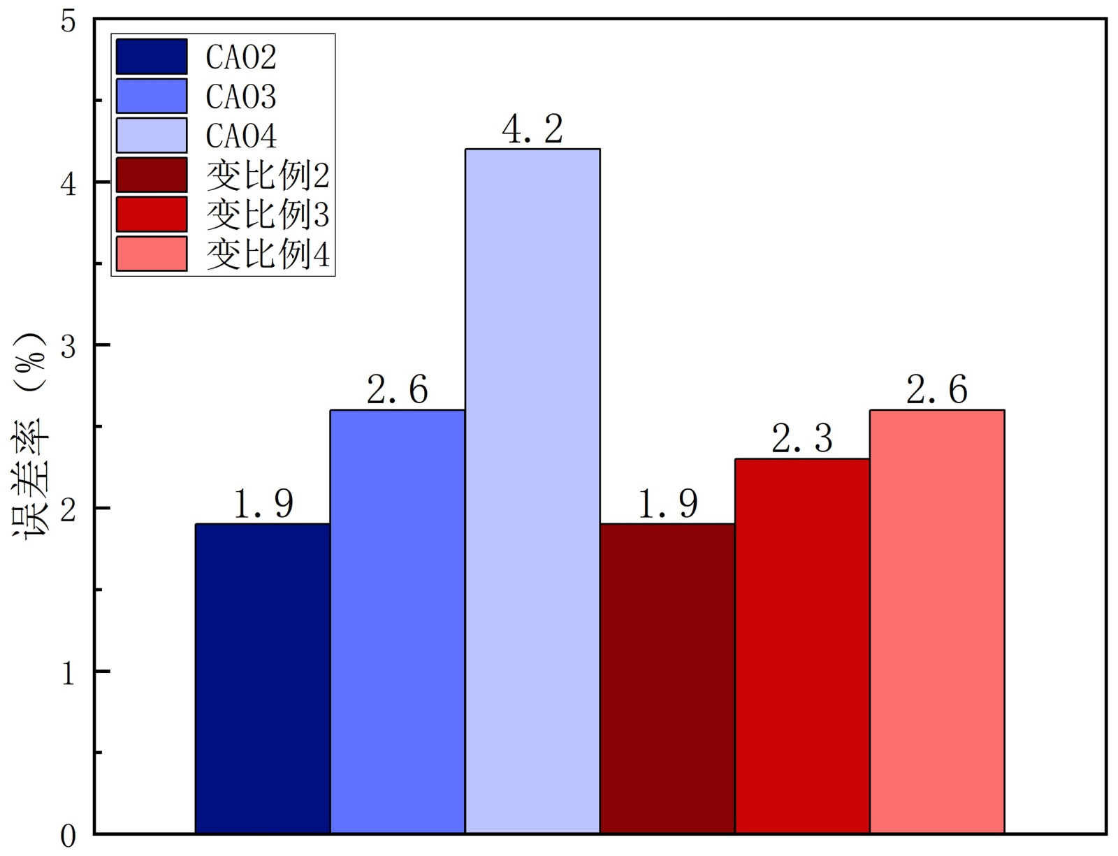 图11. 震荡后的平均堆高误差率。其中,CAO 2、CAO 3、CAO 4分别表示粗粒比为2、3、4的CAO模型误差率;变比例2、变比例3、变比例4分别表示最大粗粒比为2、3、4的变比例模型误差率