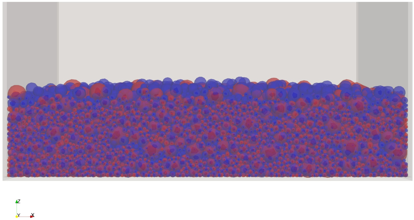 为{3, 2.8, 2.5, 2.2, 2.0, 1.5, 1.2, 1.1, 1} (分别为小颗粒至大颗粒的粒径放大系数)的沙箱震荡压实模拟。放大后的颗粒级配如图2,模拟中共生成18,852个颗粒,计算总耗时6.5小时。颗粒在重力作用下落入沙箱中,待颗粒堆稳定后,颗粒堆高36 mm,如图8。震荡后颗粒堆上表面拟合为平面后得到平均堆高为27.1 mm,震荡后的形态如图8。