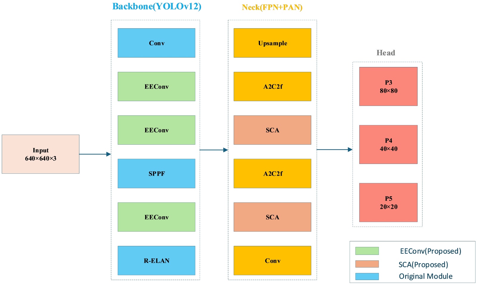 图1是SCA-YOLO的整体网络结构。该模型结构遵循经典的“骨干网络(Backbone)、颈部网络(Neck)与检测头(Head)”三段式设计。为了提升性能,本文在骨干网络层面利用EEConv模块重构了部分C3k2单元,旨在细化边缘特征的提取;在颈部网络环节嵌入SCA模块,以强化对微小目标的感知能力;引入Wise-IoU损失函数替代原有损失,显著优化模型的训练收敛效果。