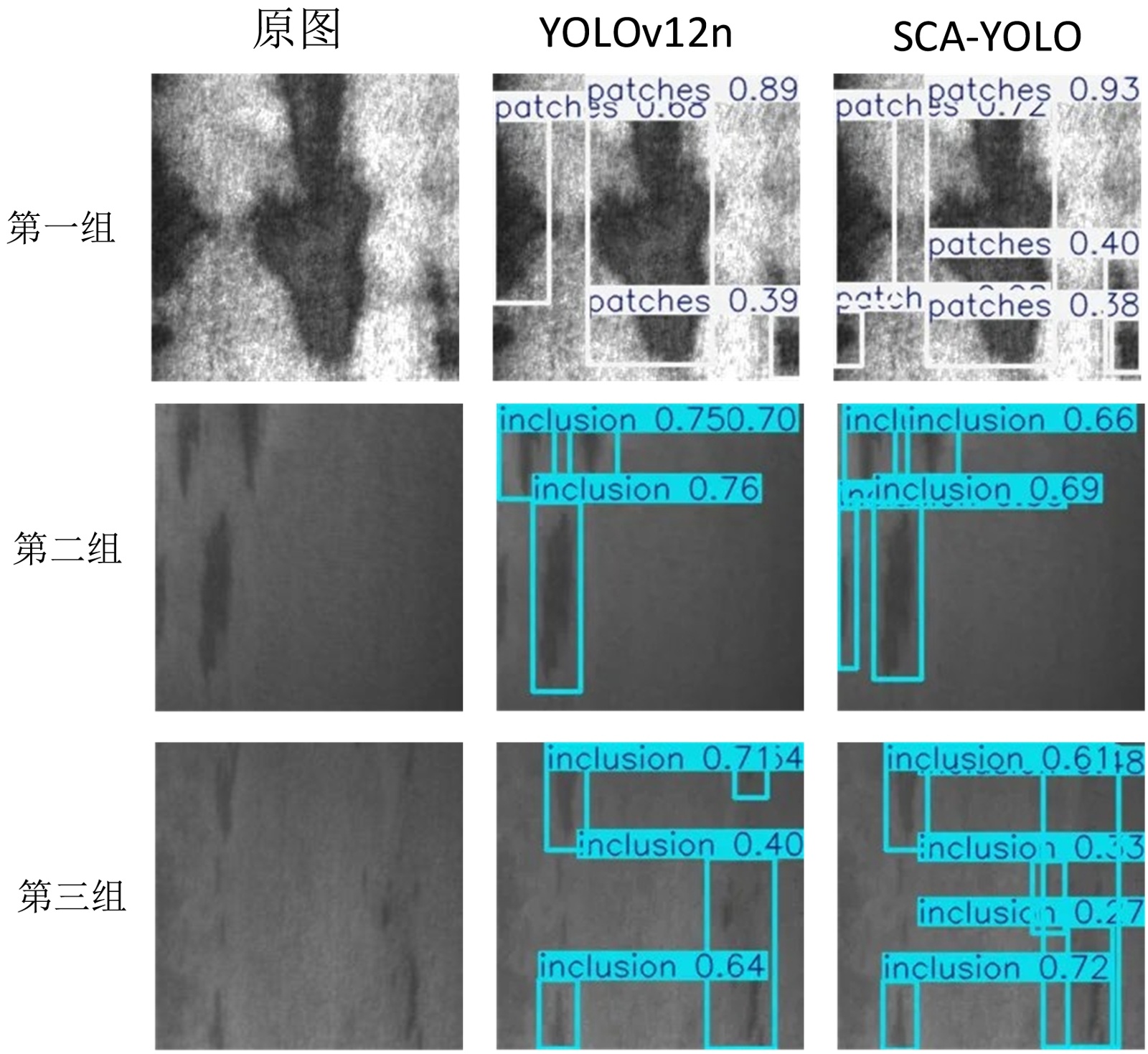 为了深入验证SCA-YOLO在复杂工业场景下的检测优势,本文选取了三组典型的难点样本进行详细对比分析,如图4所示。图中左侧为原始缺陷图像,中间为基线YOLOv12n检测结果,右侧为SCA-YOLO检测结果。