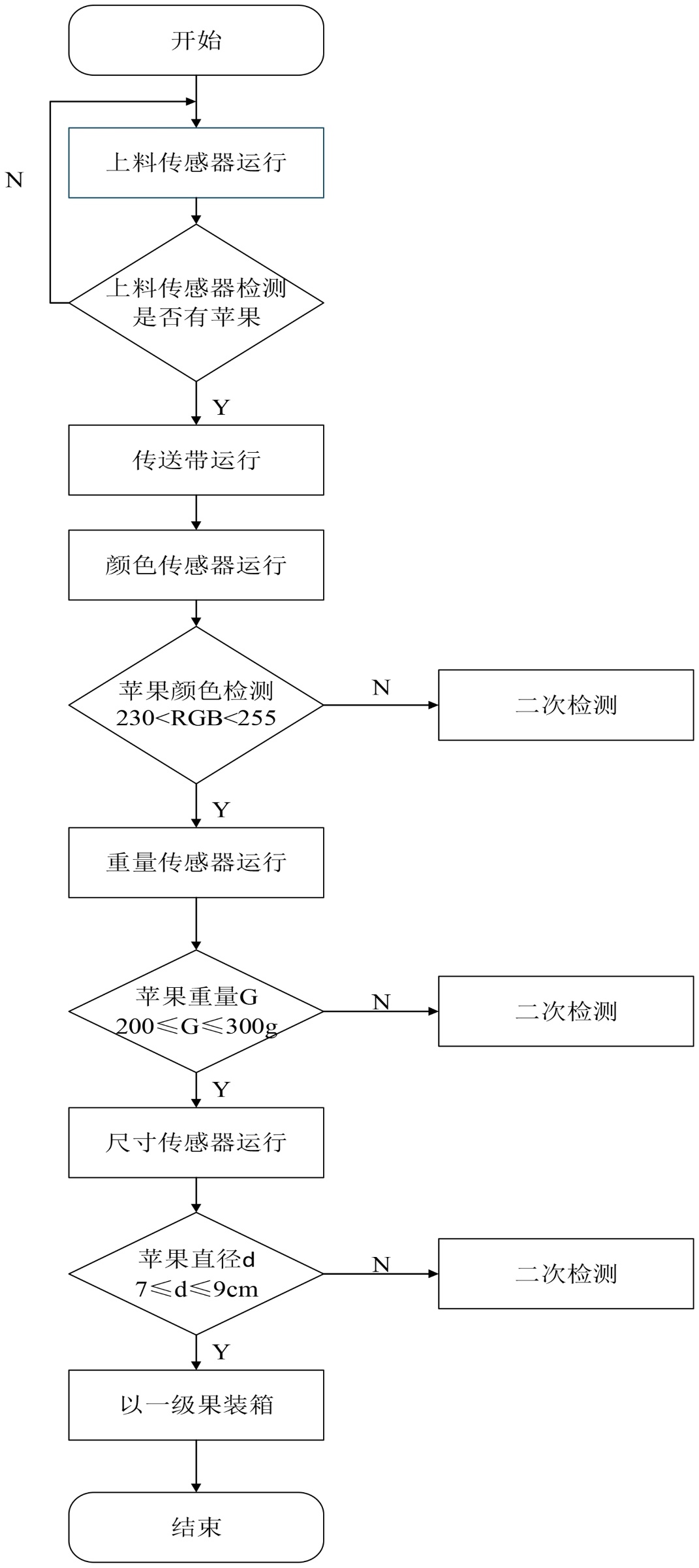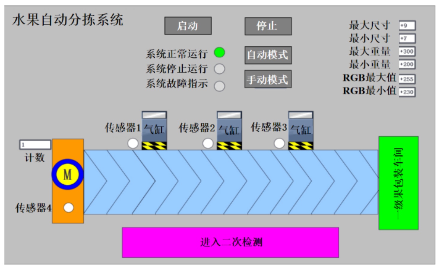 系统启动后,上料机械臂将水果逐一定位至传送带,水果随传送带匀速通过检测区。颜色传感器首先采集果皮RGB信息,重量传感器实时测量质量参数,尺寸传感器通过光电对射方式获取果径数据。PLC对多传感器数据进行融合处理,依据预设分级阈值(如一级果RGB ∈ [230, 255]、重量 ∈ [200 g, 300 g]、直径 ∈ [7 cm, 9 cm])进行逻辑判断,生成分拣指令。当水果抵达分拣区时,PLC驱动对应气缸动作,将水果推入指定等级通道,完成分拣后气缸自动复位。系统支持单周期与连续分拣模式,可通过H界面实时调整分级参数与运行速度。