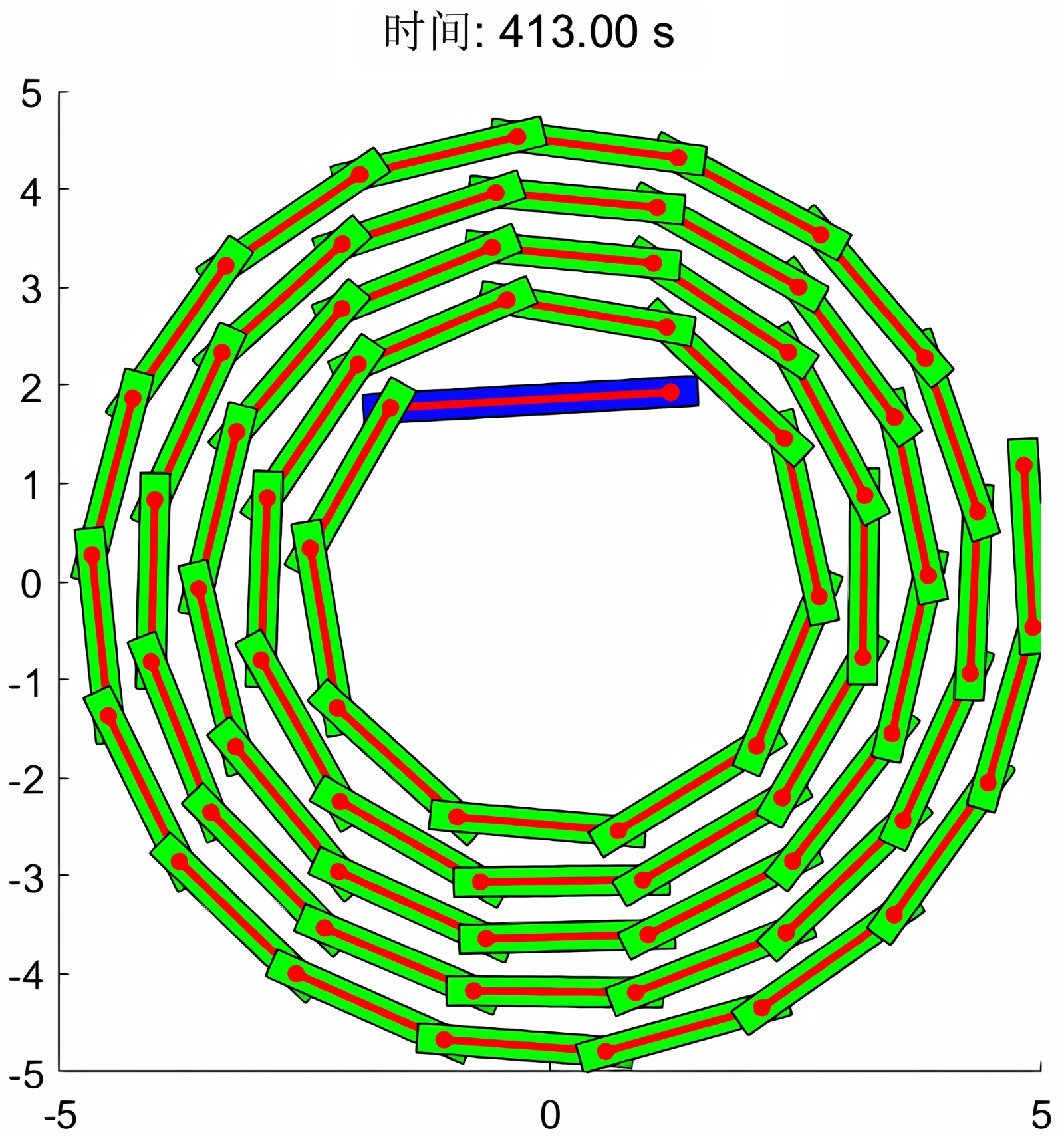 本文对板凳龙的运动进行了理想化建模:假设板凳为不可变形的刚性矩形结构,连接方式为无摩擦的理想铰接,并将其运动限制在二维平面内。这些简化有效降低了建模复杂度,便于实现轨迹规划、碰撞检测与速度优化的数学求解,但也忽略了实际中可能存在的弹性形变、连接间隙、三维姿态变化及人为操作误差等因素,可能影响模型在极端情况下的精度。