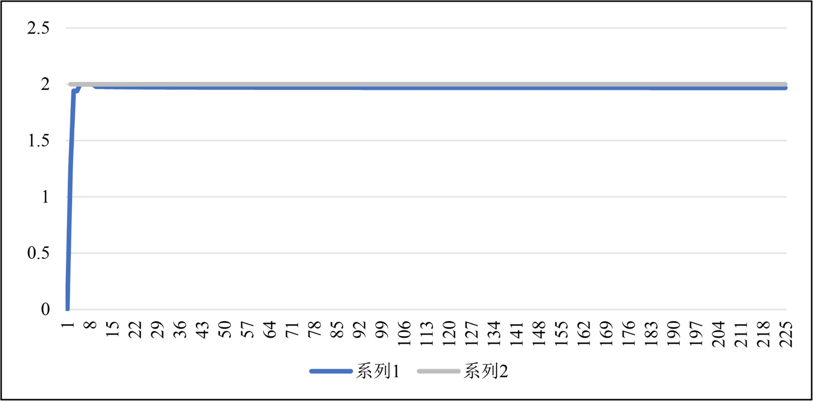 其中黄色线段表示限定的速度2 m/s,横坐标表示从龙头开始按顺序依次每个把手的序号,由图可知当龙头在1.248左右时,其他把手的速度无限趋近于2但始终小于2 m/s。由此我们可以确定龙头的最大速度为1.248181 m/s。
