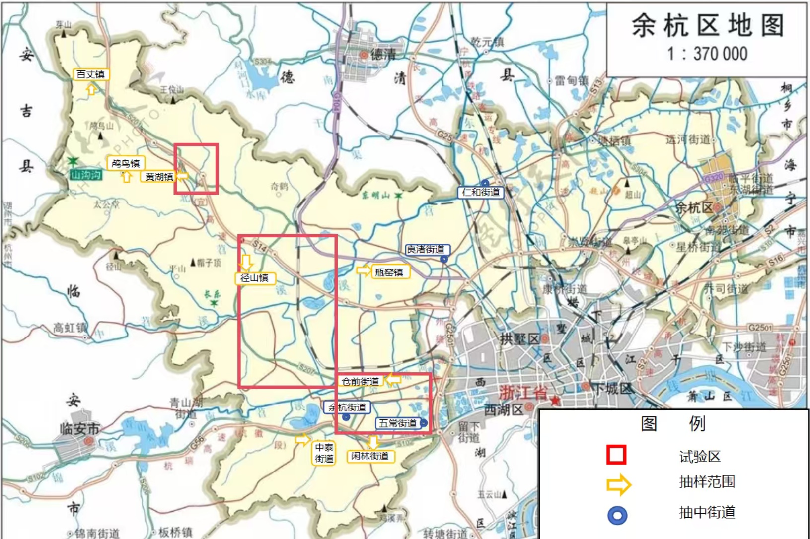 通过查找资料,我们发现余杭区不同区域的低空经济试点项目的覆盖密度不同,尤其是低空配送这一居民使用相对频繁的项目。因此,本次抽样采用三阶段,分层PPS抽样方法,通过街道–社区–配送服务点的多层次抽选,得到最终的样本单位。根据余杭区内6条低空配送试点线路信息的整理情况,剔除已经停运的路线后,将各街道(镇)根据是否有正常运营的配送或收货点分为试验区和非试验区。为了准确反映两区域之间的差异,总问卷量的初次分配按照这两个区域的人口比进行分配。在初次分配后在每个区域按人口比例进行PPS抽样抽取2个街道(镇)。本次抽样采取代码法,通过收集各街道(镇)人口数据,并进行累加和编码,然后可重复地生成两个从1到试验区/非试验区所有街道(镇)人口总数范围内的随机数,随机数对应的街道(镇)入样。由于不同街道规模差异巨大,低空经济水平也不同,这种抽样方式依据人口数量的多少决定入样的概率,确保样本分布与实际人口分布一致,减少了样本由于“抽样漂移”问题造成的代表性失衡。最终抽样结果如下表1、表2和图1所示。