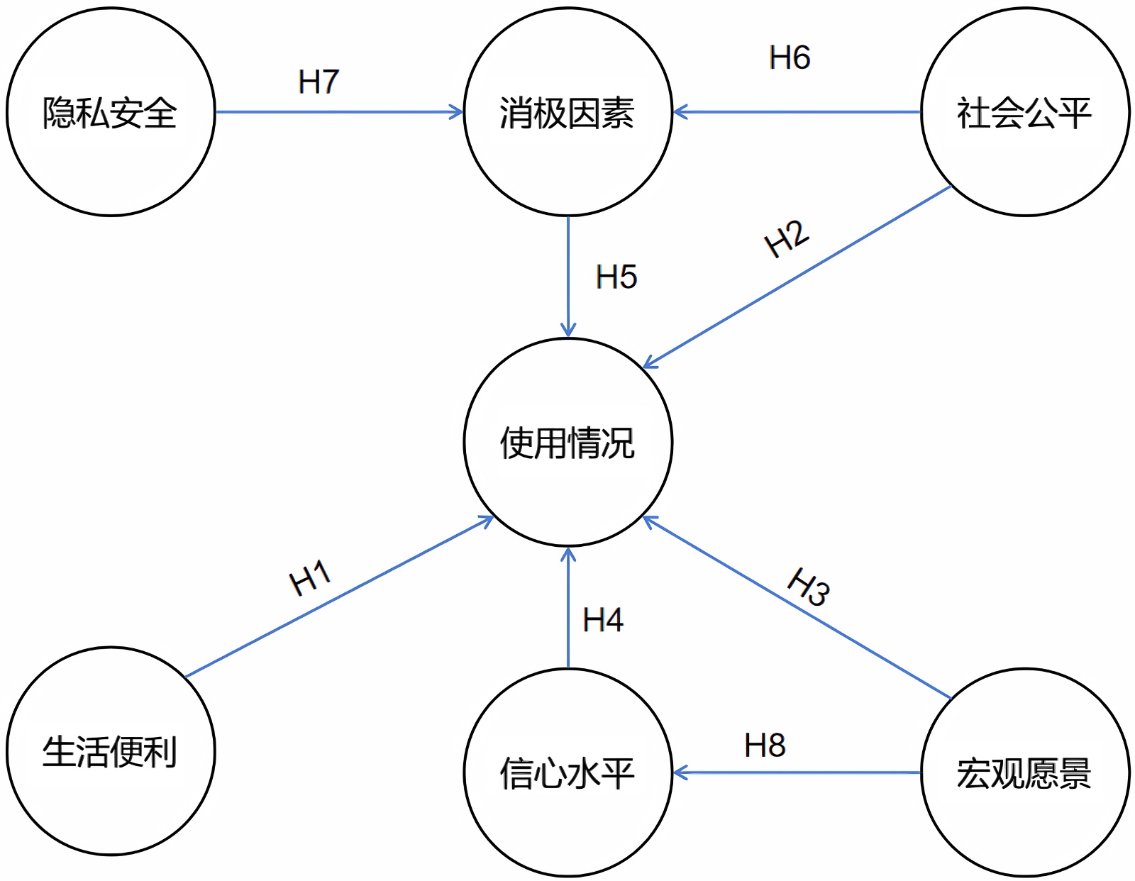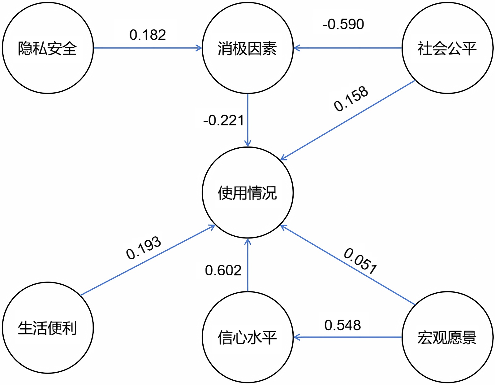 上述各项效应中,除了宏观愿景和使用情况之间,p值均小于0.05。路径系数在有关消极因素方面均为负数,其余均为正数。说明宏观愿景和使用情况之外的效应值根据原假设的方向显著大于或小于0。但是居民信心对于使用情况和社会公平都显著。由此可得,宏观展望和使用情况直接关系是不显著的,可能存在其他的间接因素连接。这也验证了之前除了H3之外所提出的假设。