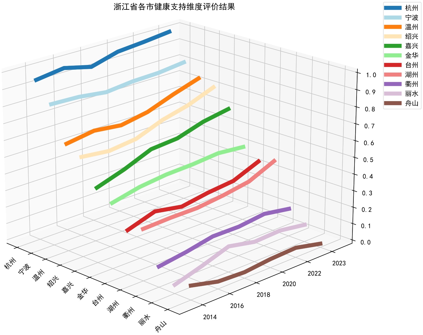 台州、湖州、衢州、丽水、舟山作为低发展水平城市,需聚焦关键领域重点突破。争取政策与资金支持,逐步提升智能设备普及率,引进先进技术推进智慧养老平台建设;针对山区、海岛试点“移动式社区食堂”“驻村康养点”,破解服务半径难题;丽水打造“浙西南康养走廊”、舟山探索“海岛康养”模式,以特色产业反哺养老基建;保持老年医保参保率全覆盖,提升基层养老与健康服务可达性,构建“基础保障 + 特色康养”的追赶格局。