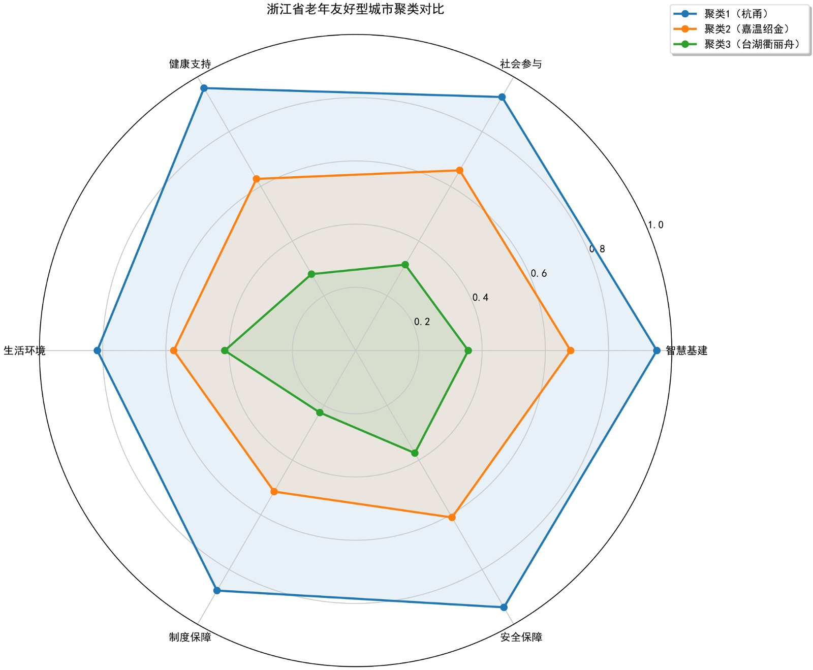 本研究立足中国新型城镇化实际,创新构建包含6个维度、21个领域、43项指标的老年友好城市综合评价体系,采用动态赋权与聚类分析将浙江11地市划分为三梯队:杭甬(第一梯队)各维度表现优异,嘉兴、温州等(第二梯队)智慧基建突出但制度保障、生活环境有短板,衢州、丽水等(第三梯队)整体滞后,制度保障与健康支持需重点突破。研究发现智慧基建是关键动力,制度保障发挥政策杠杆作用,健康支持需社会参与与生活环境协同,为不同类型城市提供差异化政策参考。